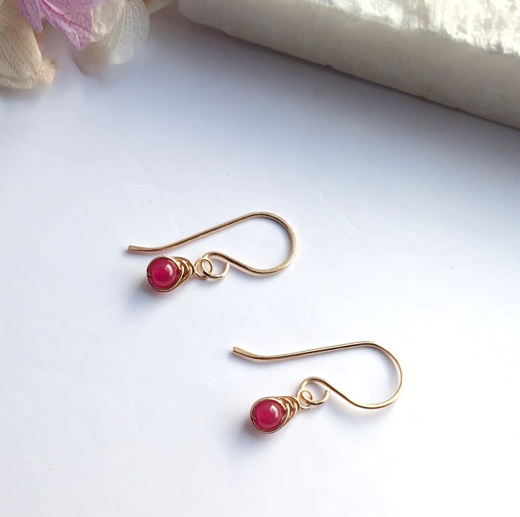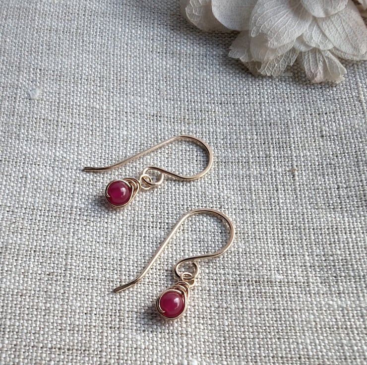 Dainty little dangle earrings featuring ruby gemstone beads. Small ruby beads wire wrapped in a herringbone weave to form a frame around the gemstones. These earrings would make a lovely gift for yourself or a loved one.