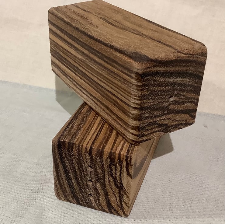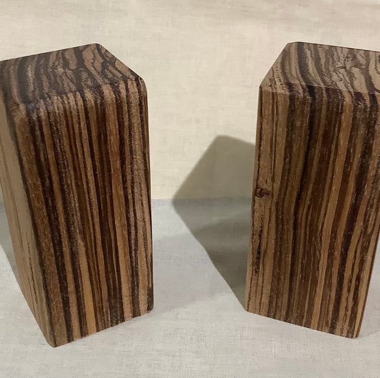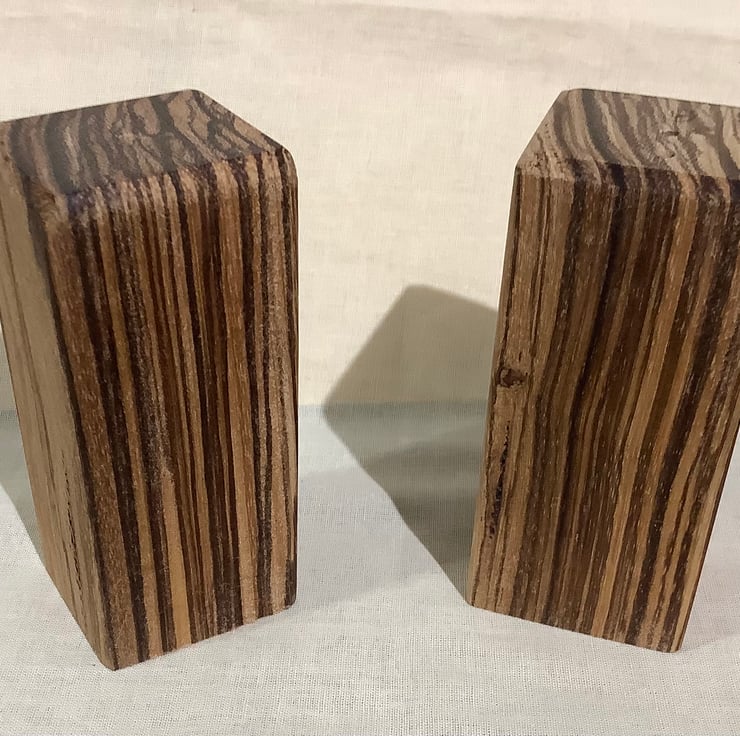 These are beautiful hand made Salt & Pepper Shakers , These are made from reclaimed hard wood,Zebrano, which gives a zebra effect. They are finished with natural beeswax from our local hives. These are unique, and a one off. They measure 4x4x10cm.