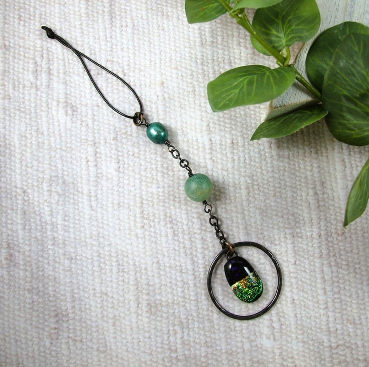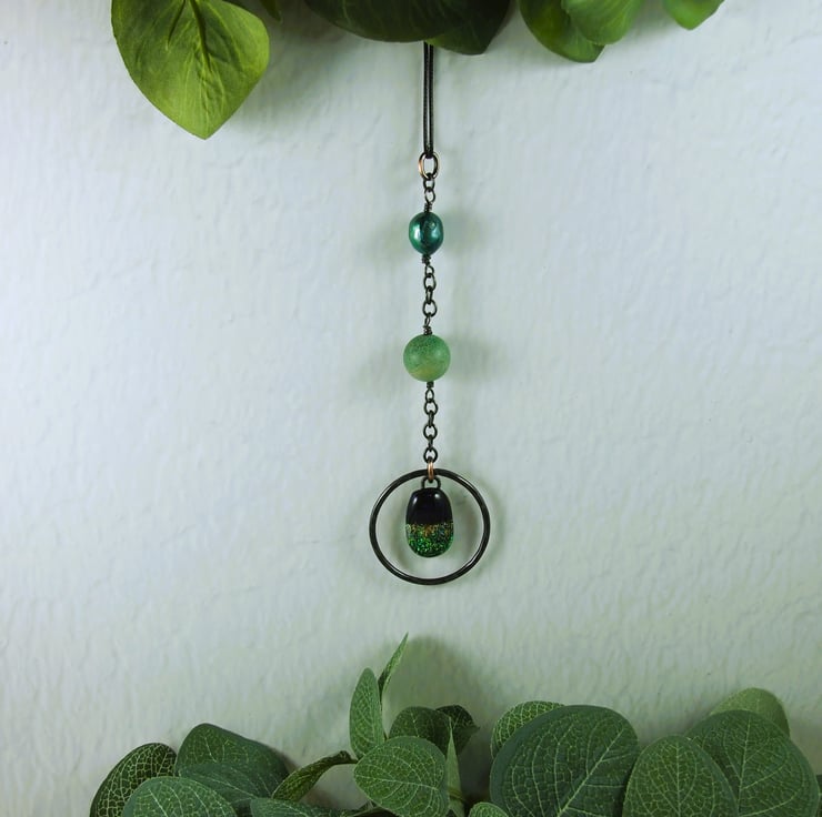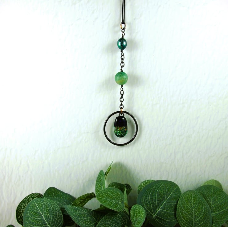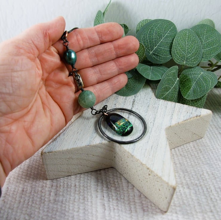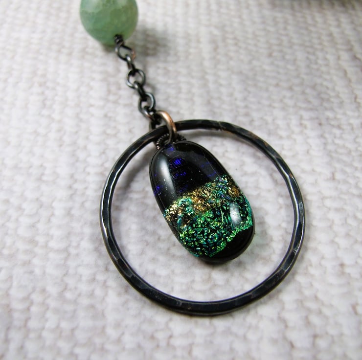 I began by creating the dichroic glass cabachon. I layer different types of glass together and kiln fire, in the kiln the glass melts and fuses together to form a natural dome shape. I have also embedded a small steel hoop into the glass for hanging. This process takes between 7-8 hours, once ready I have wire wrapped the steel hoop in fine copper wire. I have then made the copper circle from copper wire and securely wire wrapped a large green crackle agate and teal pearl to copper chain and fitted them all together. I have given the whole piece an antiqued finish.