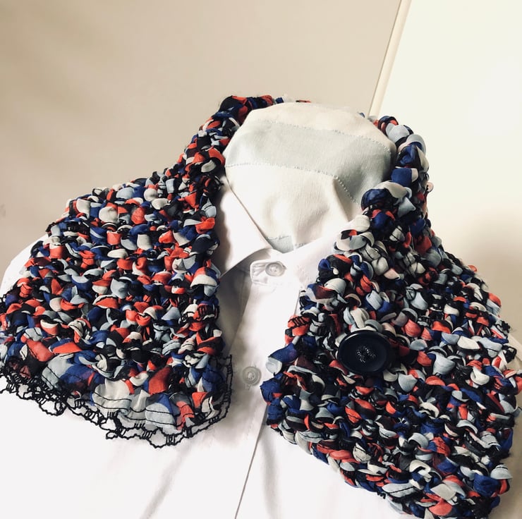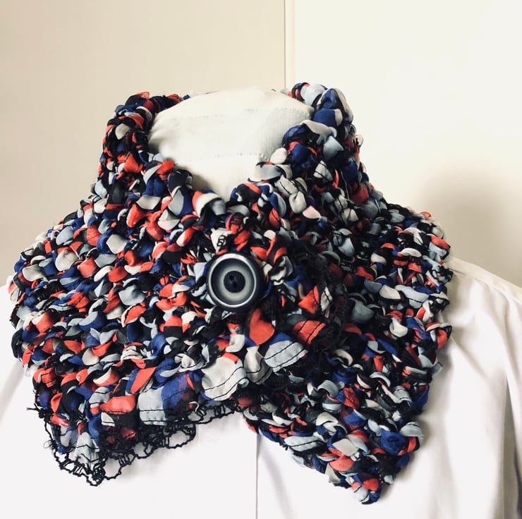 Created with a, 35%acrylic and 65%polyester blend, ribbon yarn, this scarf has been finished with a hand stitched vintage button.