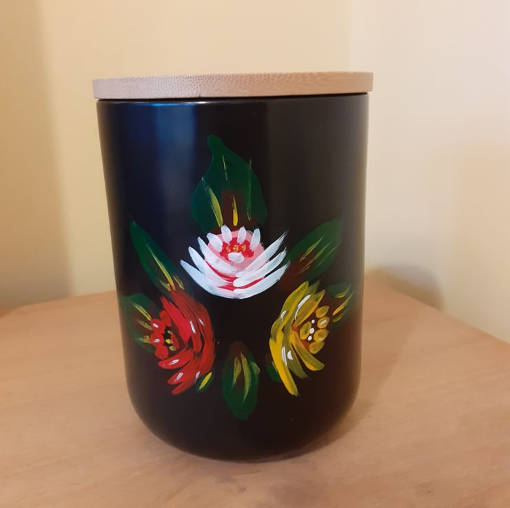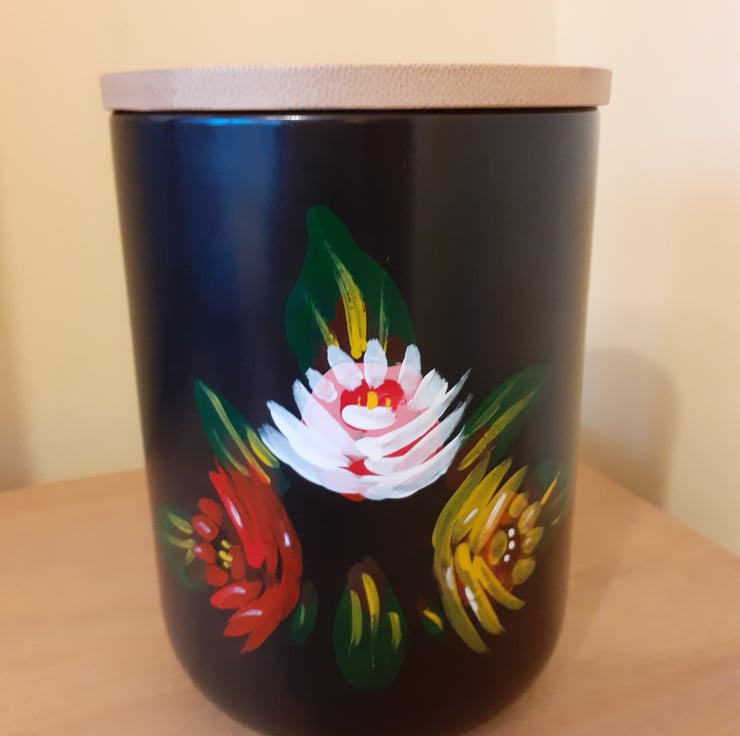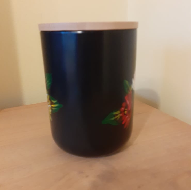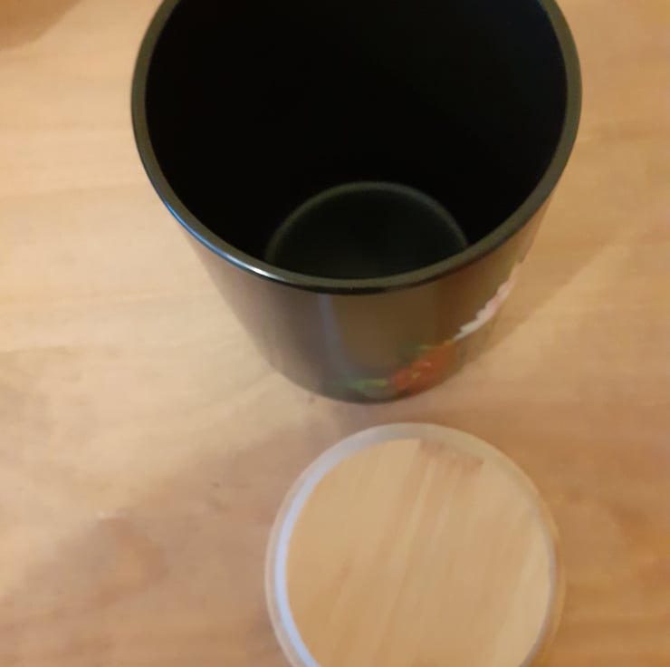 An upcycled black ceramic storage jar with wooden lid.
