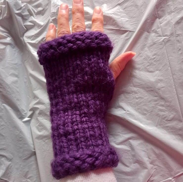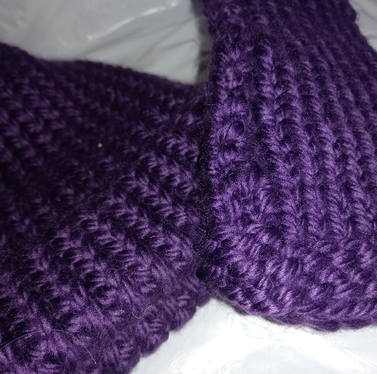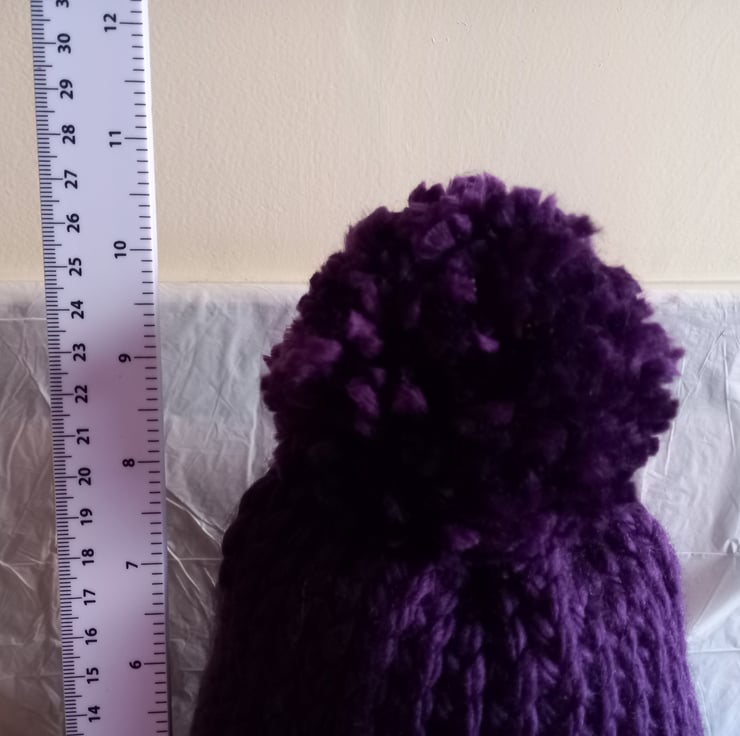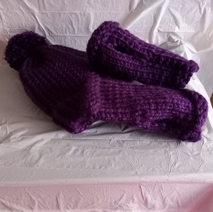 Hat, Bobble & Mittens: knitted with Super Chunky 100% acrylic yarn. The hat & mittens are in a deep purple colour.