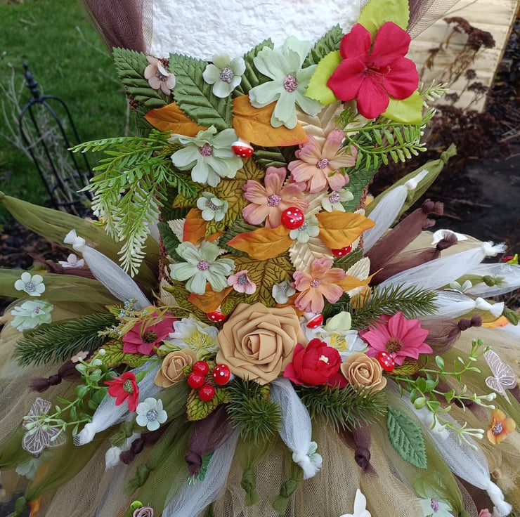 The top is a crochet, stretchy tube style top and the skirt is attached to the bottom layers. The top is decorated on the front with foliage, flowers, and mushrooms as well as other little accessories. The top is also fully lined at the front with felt so the decorations will not irritate your child.