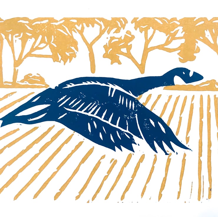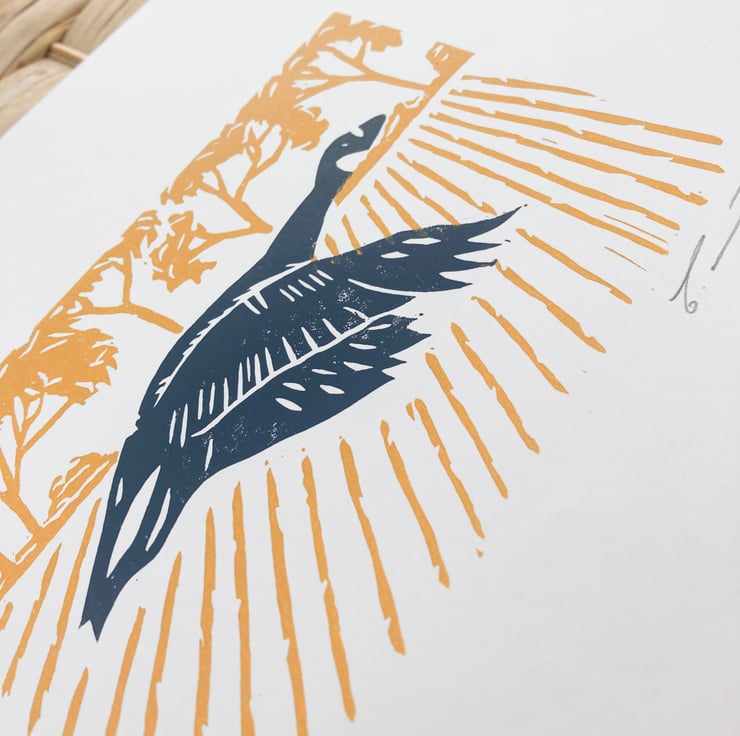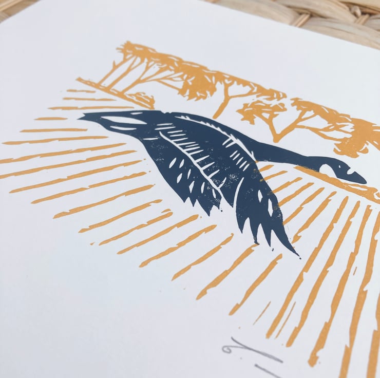 This Lino print has been hand printed in the UK in my home studio. I’m inspired by walks in the Norfolk countryside, and love to see the Geese Flying over in winter.