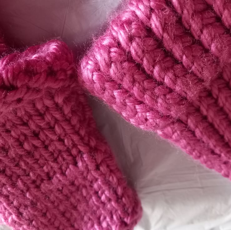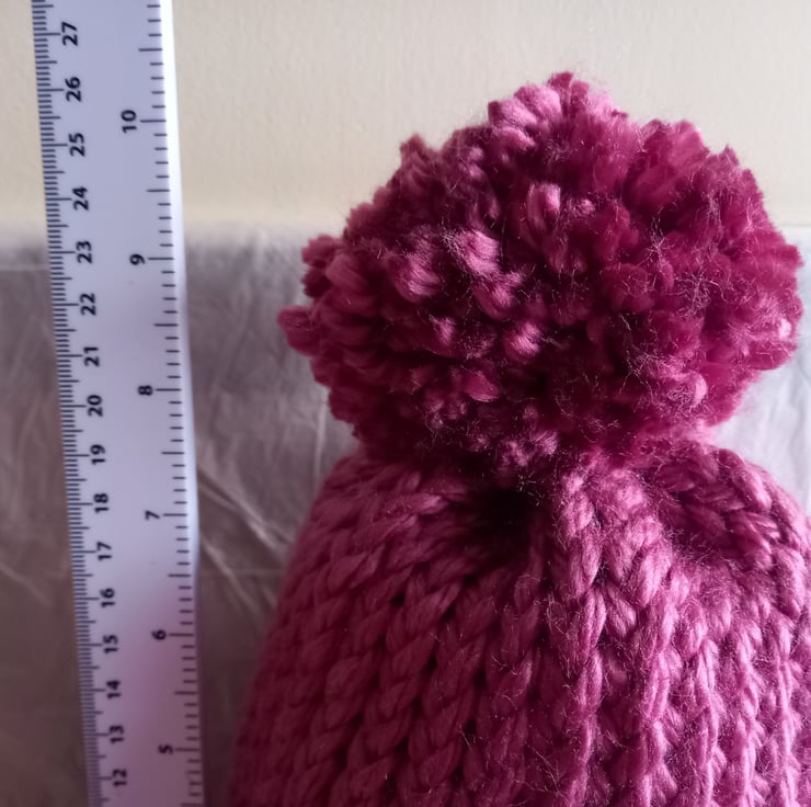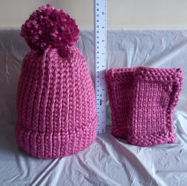 Hat, Bobble & Mittens: knitted with Super Chunky 100% acrylic yarn. The hat & mittens are in a dusky pink colour.