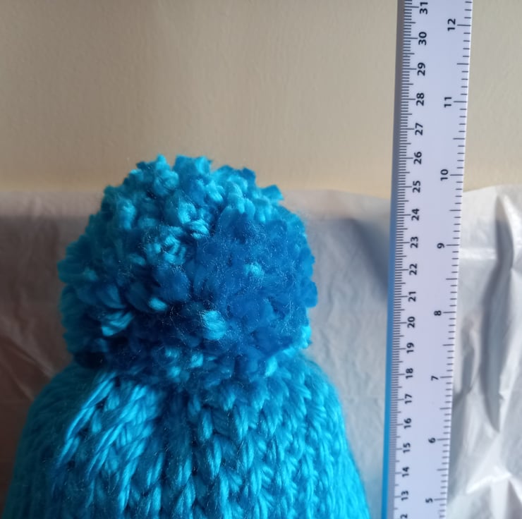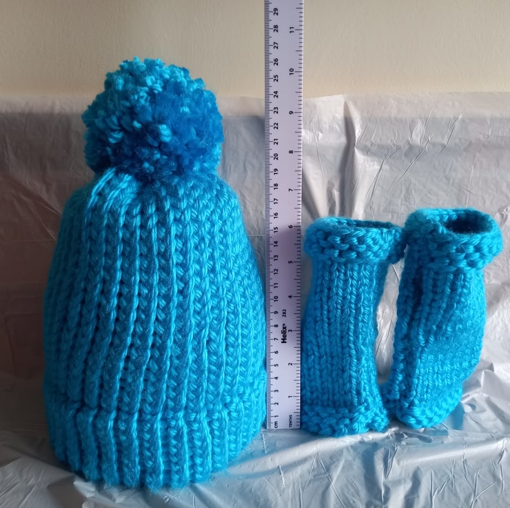 Hat, Bobble & Mittens: knitted with Super Chunky 100% acrylic yarn. The hat & mittens are in a bright blue colour.
