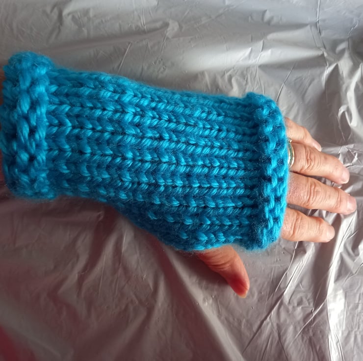 Fingerless mittens will fit from a small to medium size hand; they are approximately 6.5 inches (16.5 cm) in length.