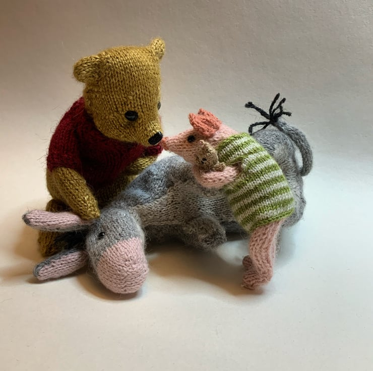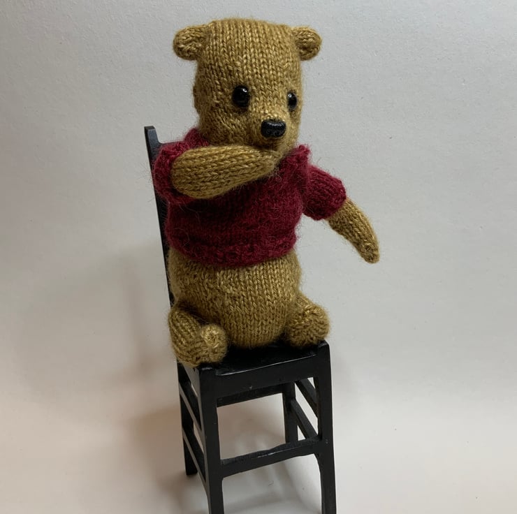 Hand Knitted by me using soft Alpaca yarns and the Dot Pebbles Honey Bear Pattern.