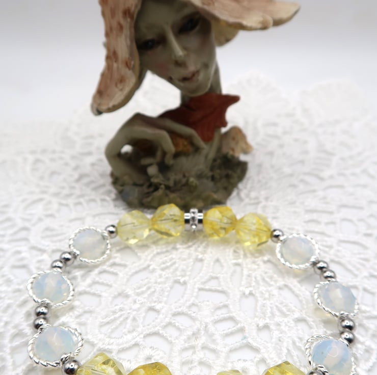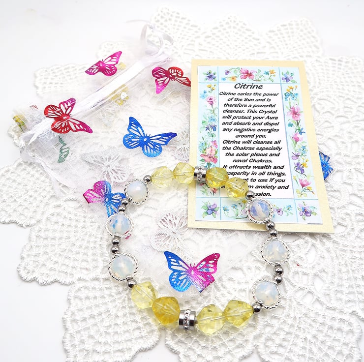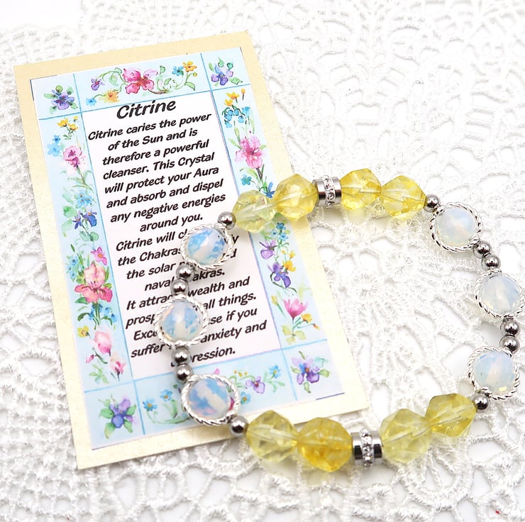 These two Crystals go so well together. I have used 8mm Facetted Citrine Beads and teamed them with 8mm Facetted Opalite Beads. The 3mm Beads are Stainless Steel. All other Beads are Silver Plated.