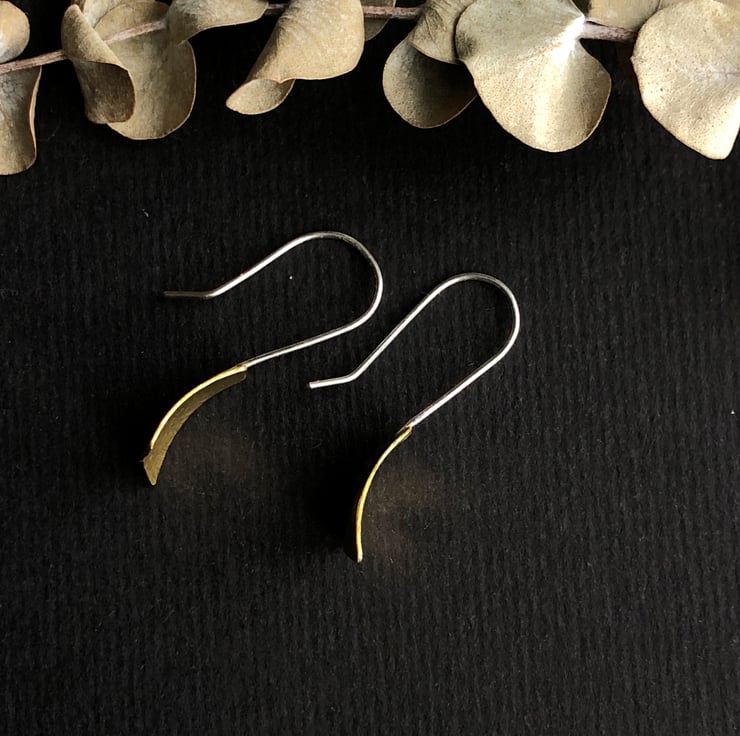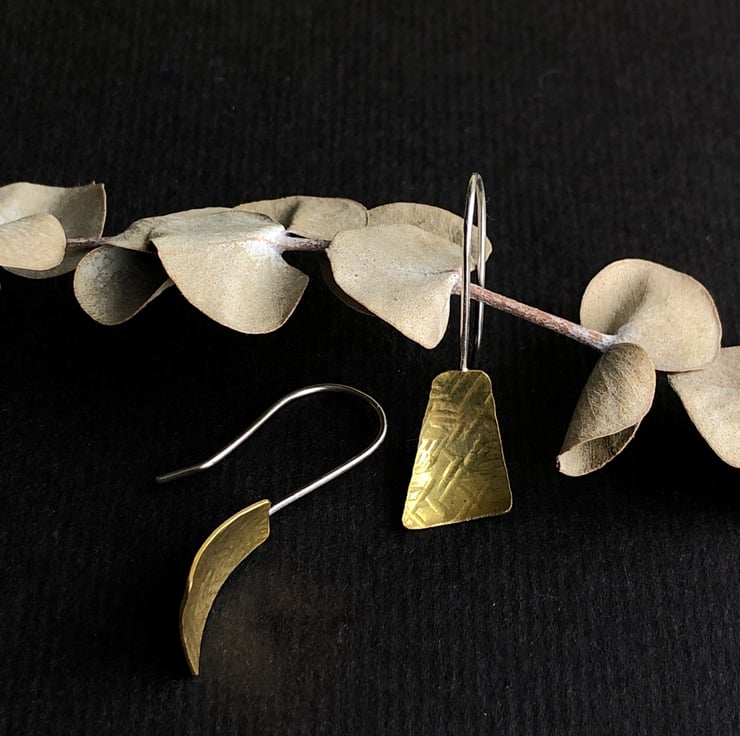 Brass and sterling silver drop stud earring. Brass stud earring with hammered detail. Statement stud earring