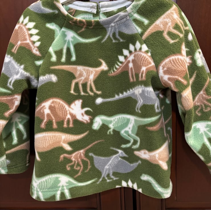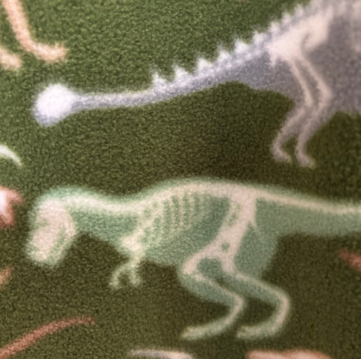 The fabulous dinosaur print shows the skeleton of the dinosaurs, in shades of green and cream.