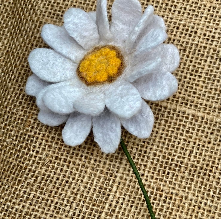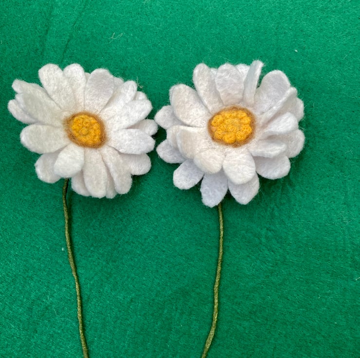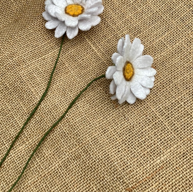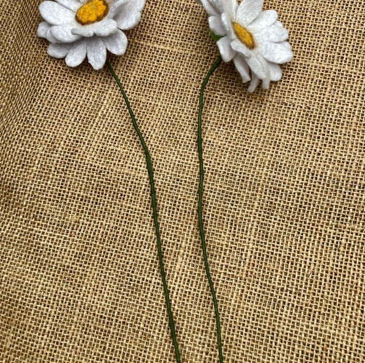 These two pretty daises are handmade using felt. First I made the white felt using merino wool and the wet felting process and then shaped them into the daisies. The central part is needle felted to create the yellow centres. The daisies have then been felted onto wire, which has been wrapped in florist tape. The flowers are 22.5cm in diameter. The wire is approx 34 cm long and can be bent to fit a vase. These flowers are environmentally friendly in the respect that you can keep them and not throw them away!