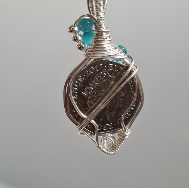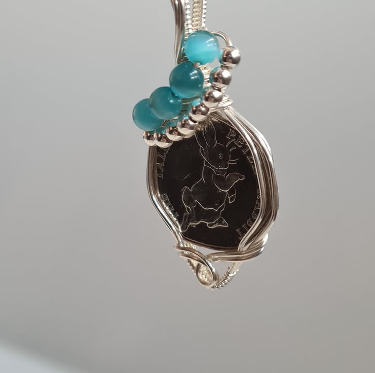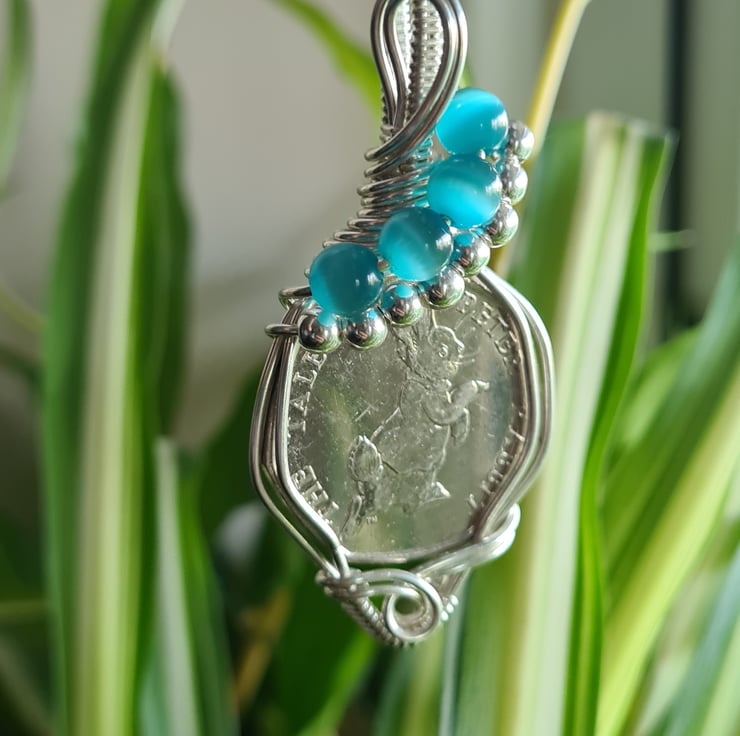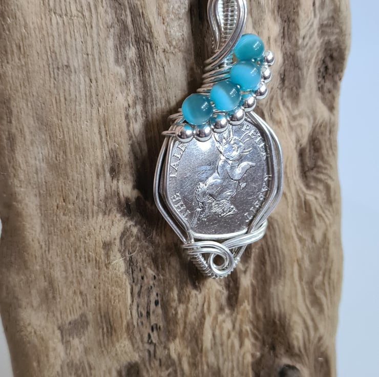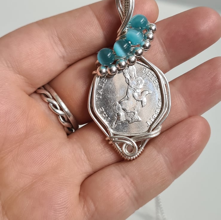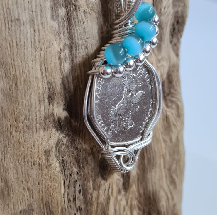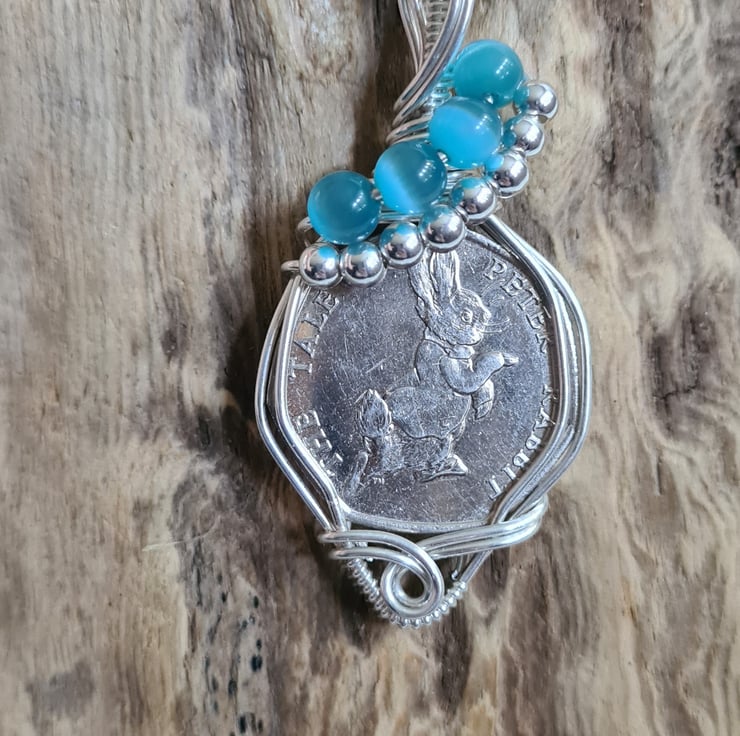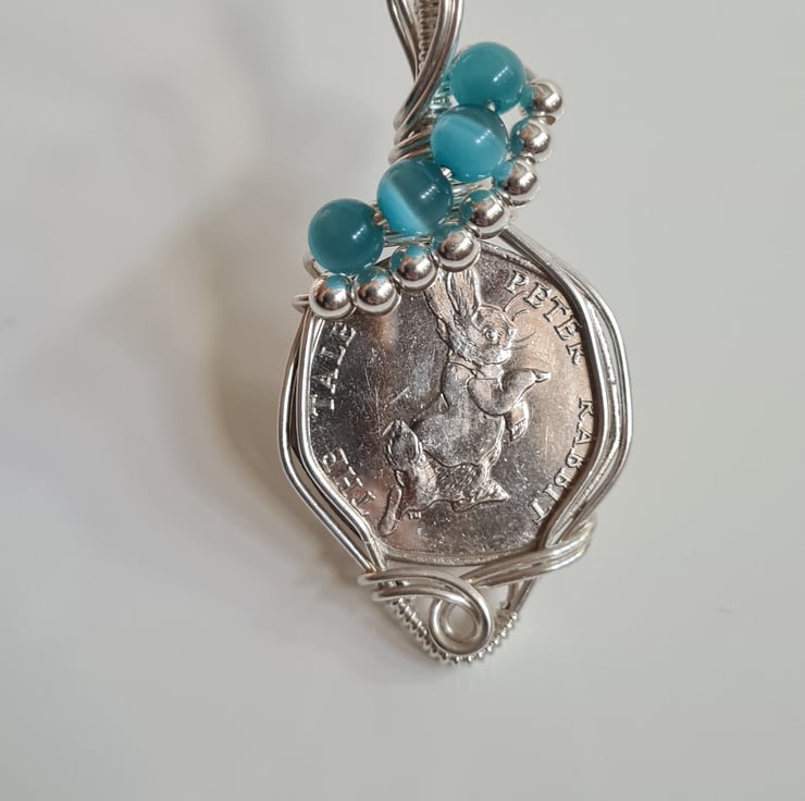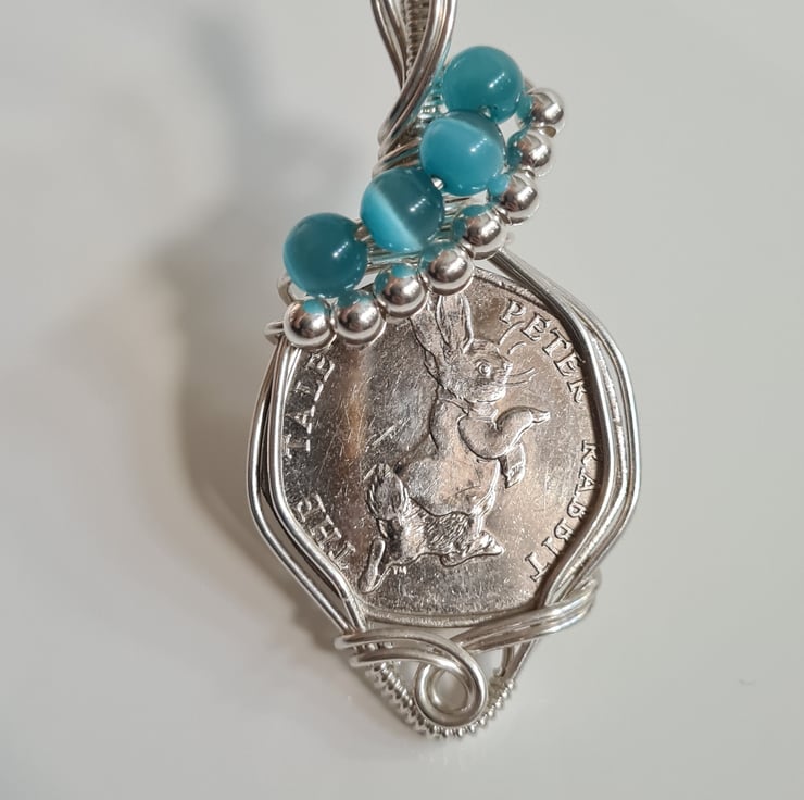 I have created this totally unique pendant using this beautiful "The Tales of Peter Rabbit" Beatrix Potter 2017 50p coin which I have wrapped in 925 Silver and finished with Sterling Silver beads and gorgeous light blue faux cats eye beads. This is a really cute lttle coin with a lovely image of Peter Rabbit to the front.