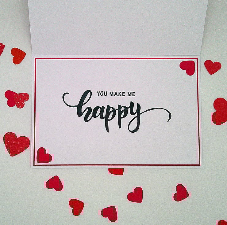 The inside of the card continues the bold theme with a big stamped sentiment which reads ‘You Make me Happy’.