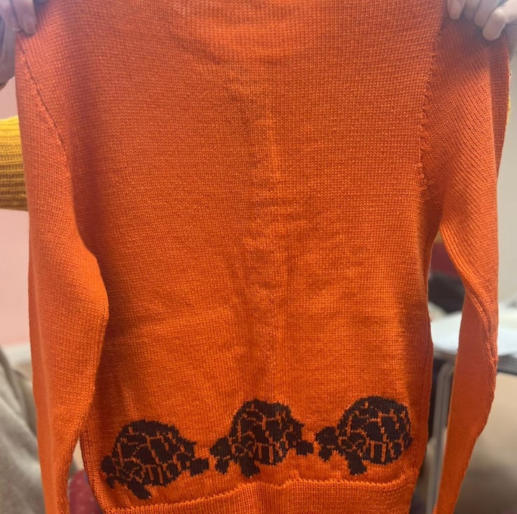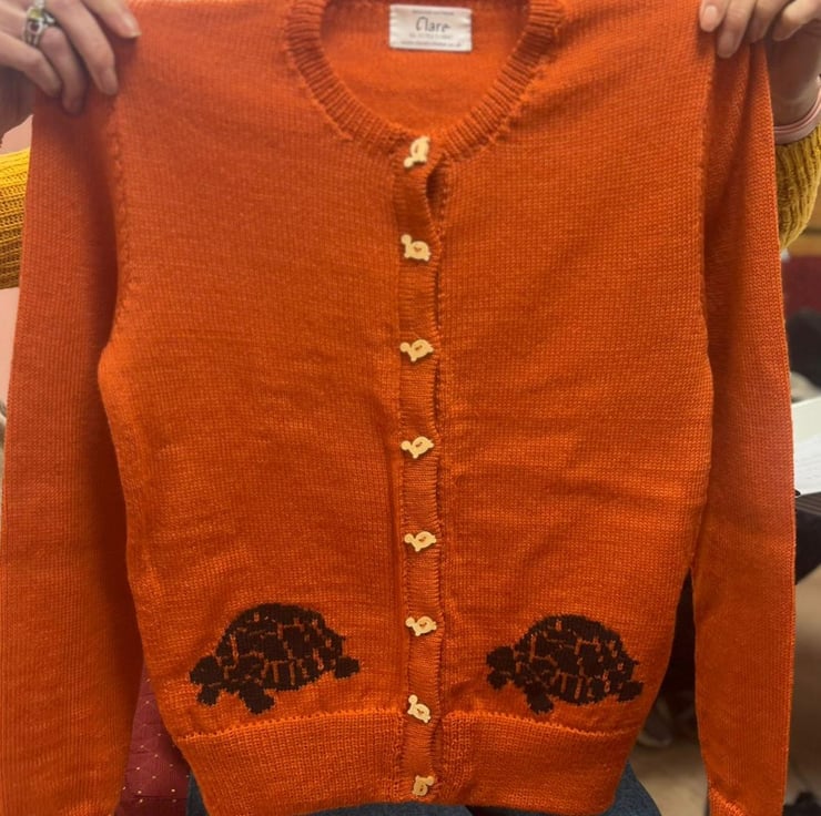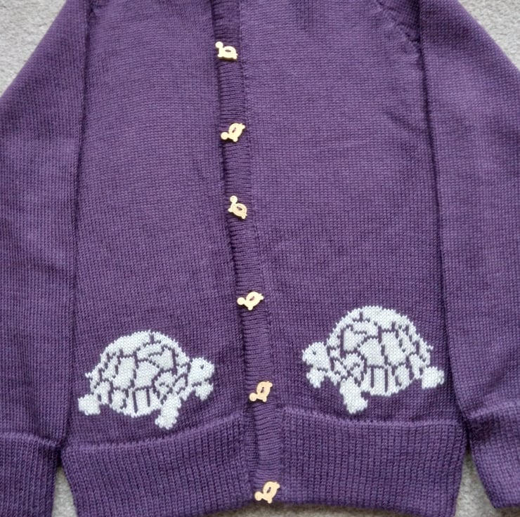 Tortoise cardigan made to measure in adult sizes in any colour. 100% machine washable merino blend wool. Tortoise motifs on front and back. Wooden tortoise buttons.