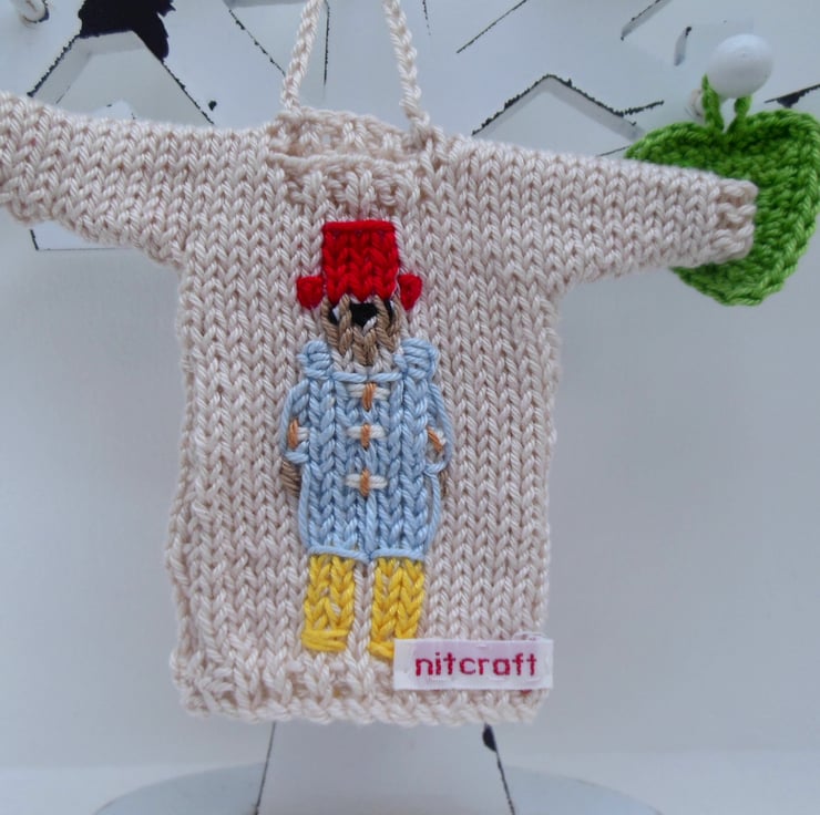 Unique hand knit mini sweater ornament starring Paddington Bear.