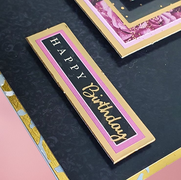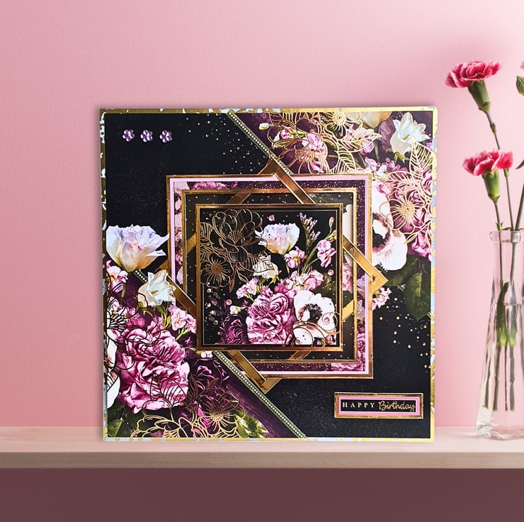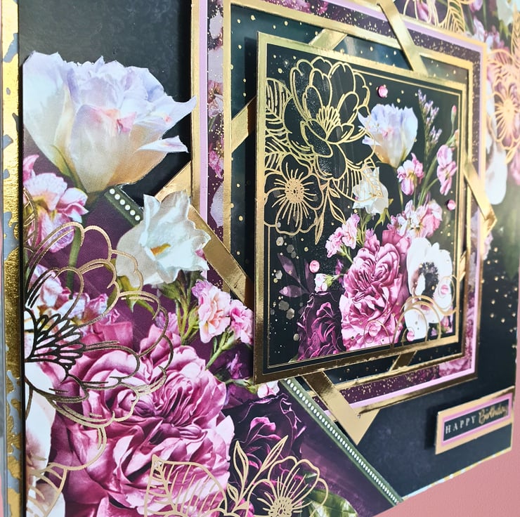 A stunning, handmade keepsake card with flowers, in black, with with gold foiled frames & colourful floral toppers. Ideal for sending your birthday wishes & impress someone special, or a flower lover!