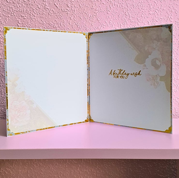 It consists of white card base layered with gold paper, gold foiled cardstock printed with florals & framed toppers. The main square topper lays in the middle & displays a close up picture of colourful flowers, surrounded by matching, gold foiled frames. Two fussy-cut diagonal, floral panels decorate opposite corners & are raised for dimension. The sentiment "Happy Birthday" lays on the bottom right corner of the card. It is finished with matching diamante & gemstones. Inside, the coordinating double insert lays on the same gold frame as the front & displays the message "A Birthday Wish For You" heat embossed in gold.