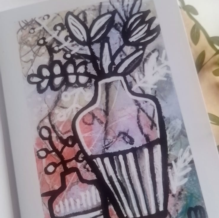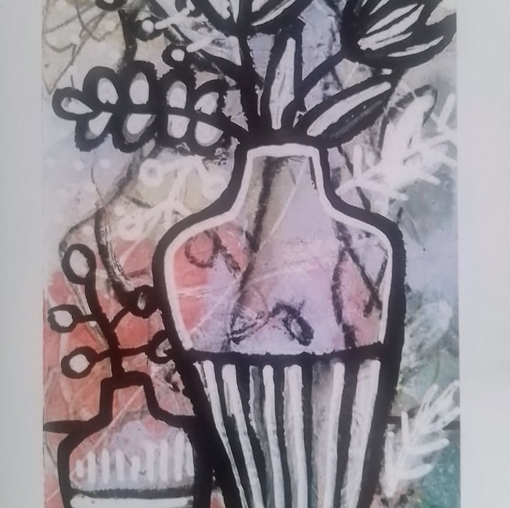 ..this formed a beautiful textured base upon which I intuitively drew and painted this bold image of vase and flowers ..a theme that I use recurringly in my work ..