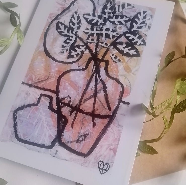 A beautiful greetings card depicting Vases & Botanical Forms in an Original and Expressive Style in Monochrome x