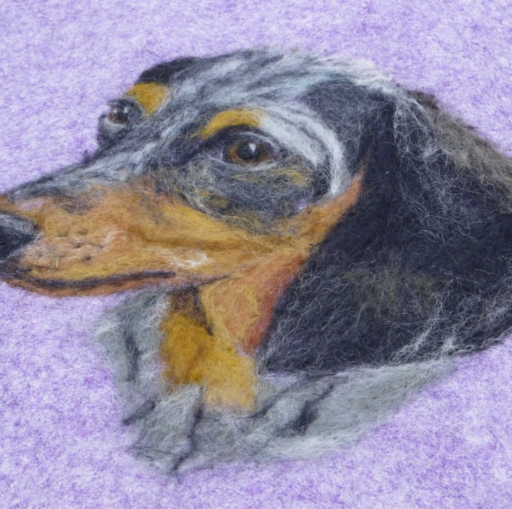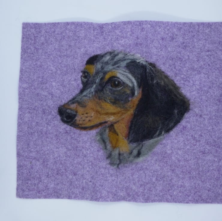 Handmade needle felted realistic original artwork of a dachshund. The felt measures 12 x 10inch, felted onto a purple heathered felt and made using a mix of natural and dyed wools. This one off artwork comes unmounted and unframed and would be up to the buyer to choose the correct frame.