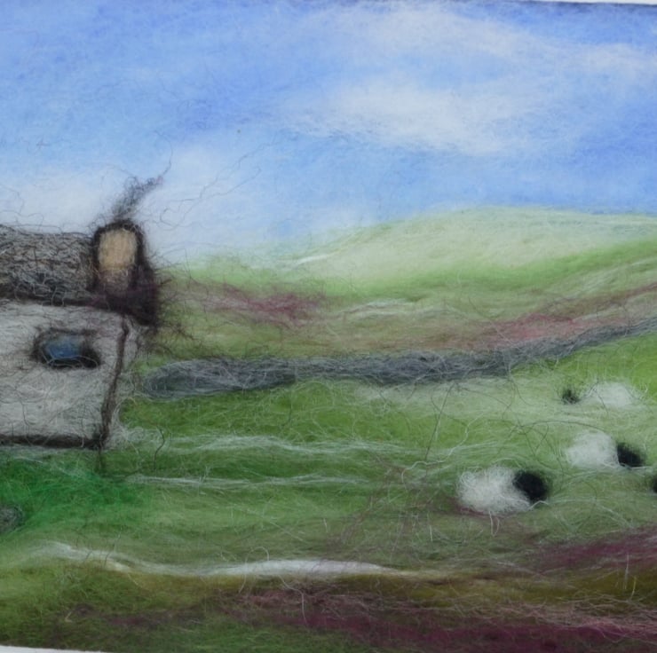 Handmade original needle felted artwork of a countryside landscape with cottage and sheep ,made using a mix of natural and dyed wools and silk fibres. Due to the nature of the wools and fibres used, each of our art is a one off piece and can not be exactly replicated.