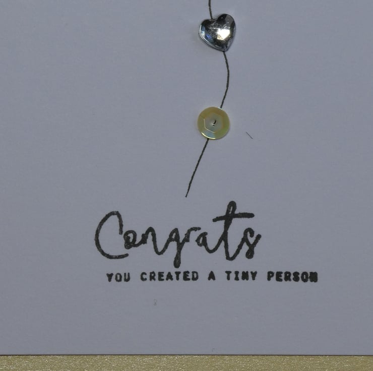 The message 'Congrats you created a tiny person' has been hand stamped in black archival ink at the bottom of the card to complete the design.