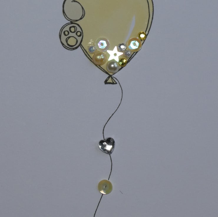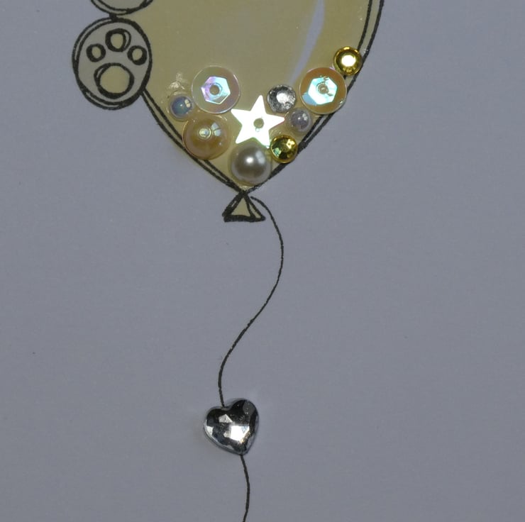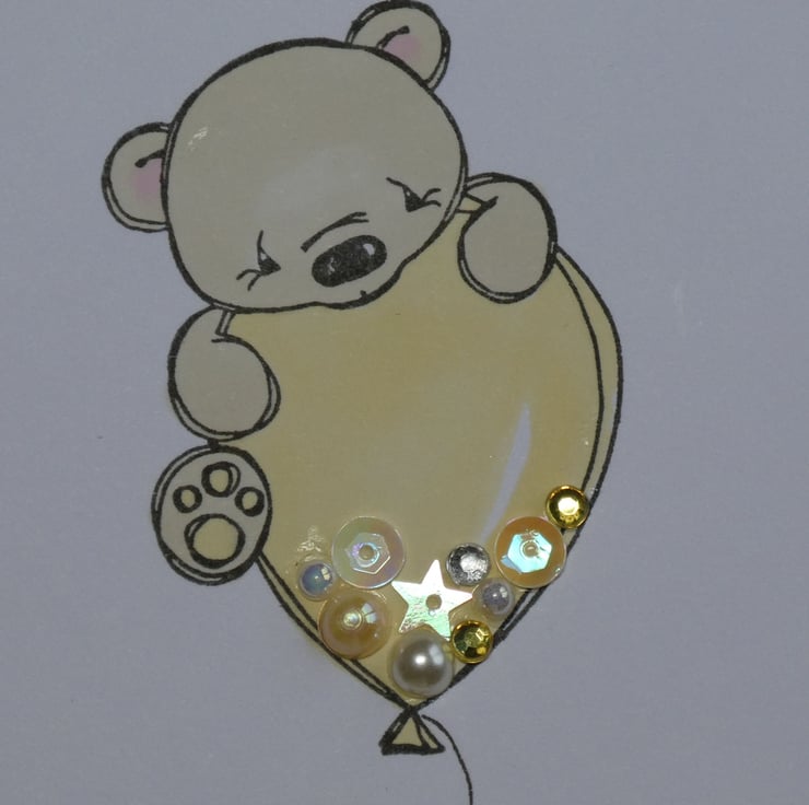 The image of a bear holding onto a balloon has been hand stamped and inked in soft beige and lemon. A selection of sequins, faux pearls and faux gemstones in shades of silver and yellow have been added at the bottom of the balloon and on it's hand drawn trailing string.