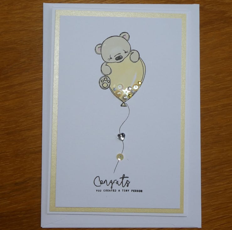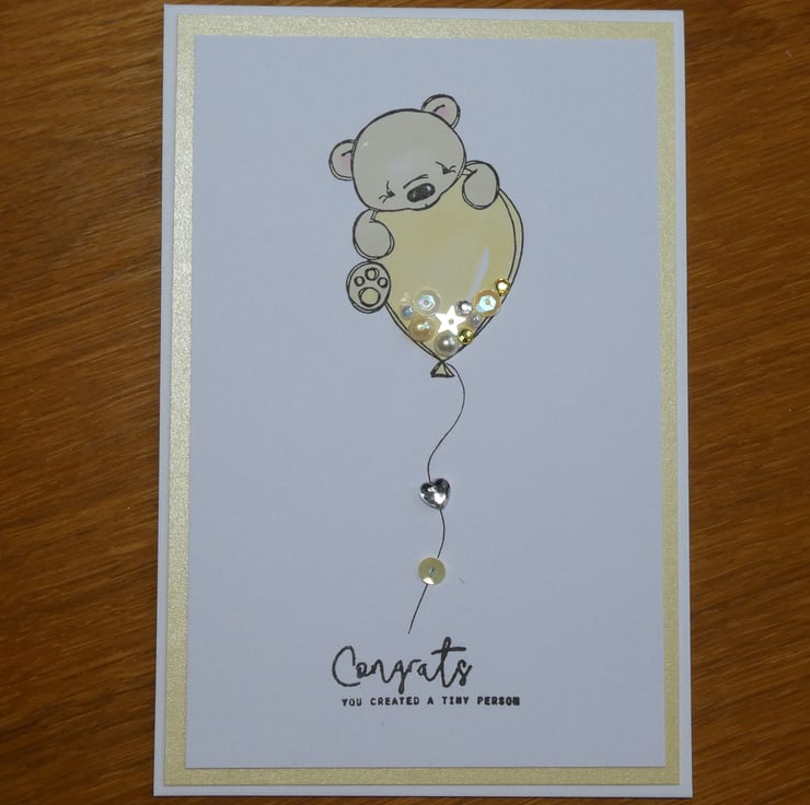 This new baby card has been hand stamped with a teddy bear holding onto a drifting balloon, coloured in soft paste lemon and finished with a mixture of sequins and faux pearls. It would be ideal if you wanted to be ready with a card before you knew the sex of the baby or if you wanted to send a more neutral card.
