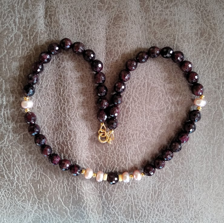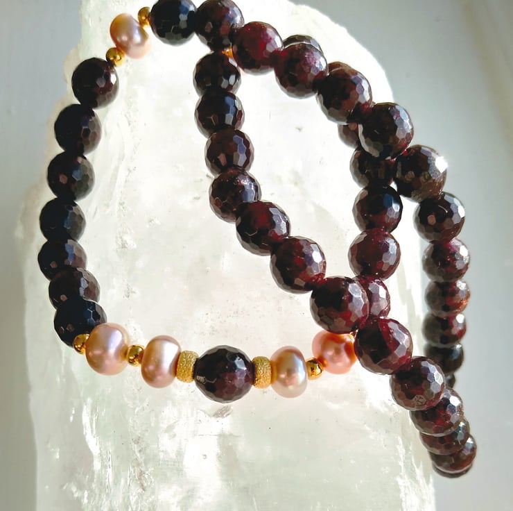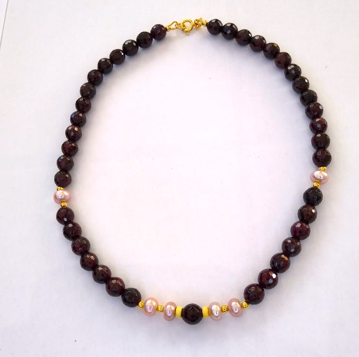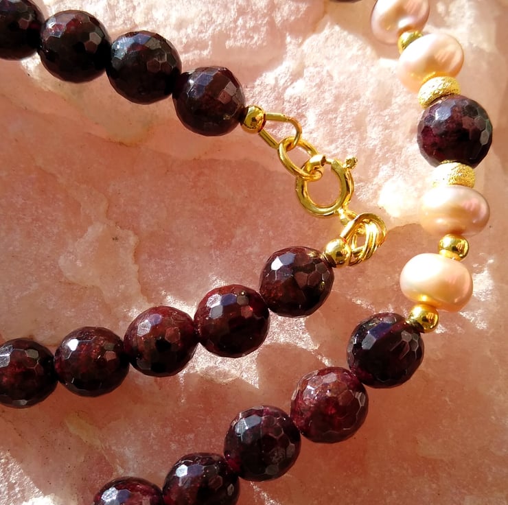 Beautiful vintage rose natural freshwater button pearls, sandwiched between rich deep red faceted 8mm natural Garnets. The colours of the garnets and the pearls are highlighted against the lustre of the yellow gold plating on 925 sterling silver, of the stardust spacer beads. Length 41cm (16 inch) approx