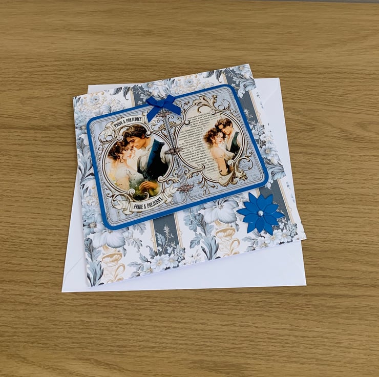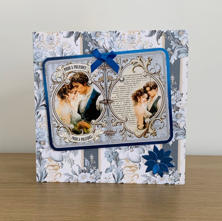 The Pride & Prejudice topper has been printed onto glossy photo paper, which has been attached to coordinating cardstock. This is then been attached to the front of the card with foam pads to give the card dimension.