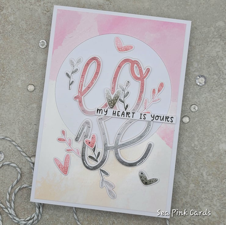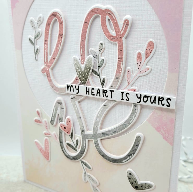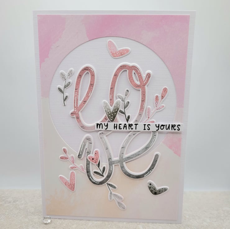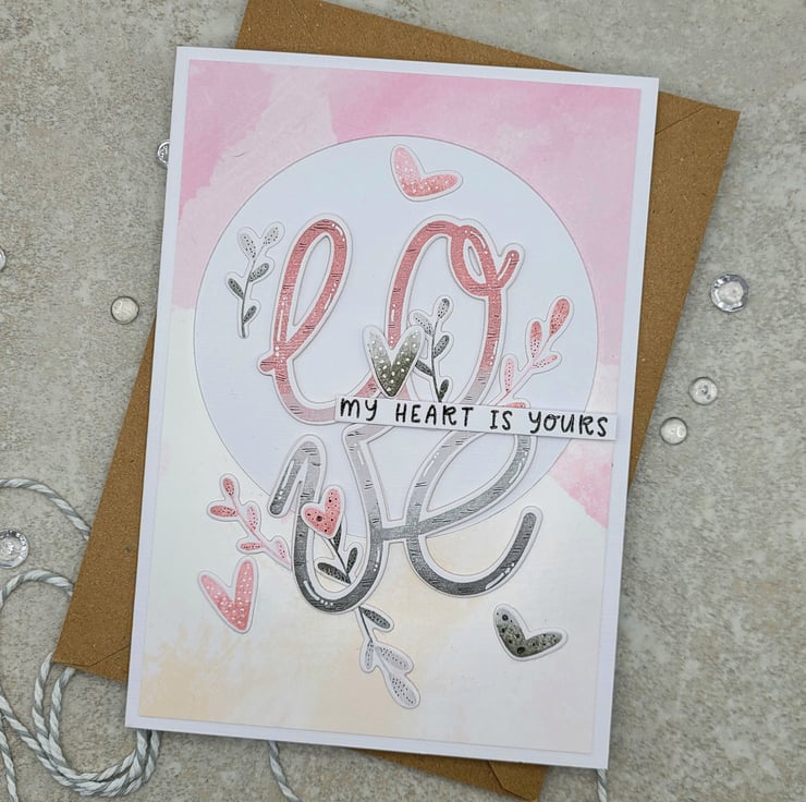 A love themed card with a big 'love' sentiment. An individually handmade card for valentine's day or an anniversary. It is blank inside for your own personal message. All the elements of the card have been made in my craftroom. Measuring 12.5 x 17.5 cms the card base is made from 300gsm white linen card and abstract coloured card. The word 'love' , foliage and hearts have been stamped by hand and then die-cut with metal cutting dies. I cut additional layers of the 'love' sentiment and layered them together to create a 3D image. There is a small stamped sentiment which reads 'my heart is yours' in handwritten style font, I have heat embossed this. I have used archival inks for stamping in dusty pink and grey tones. The greetings card comes supplied with a 100% recycled brown kraft paper envelope.