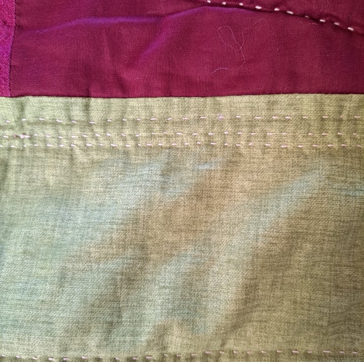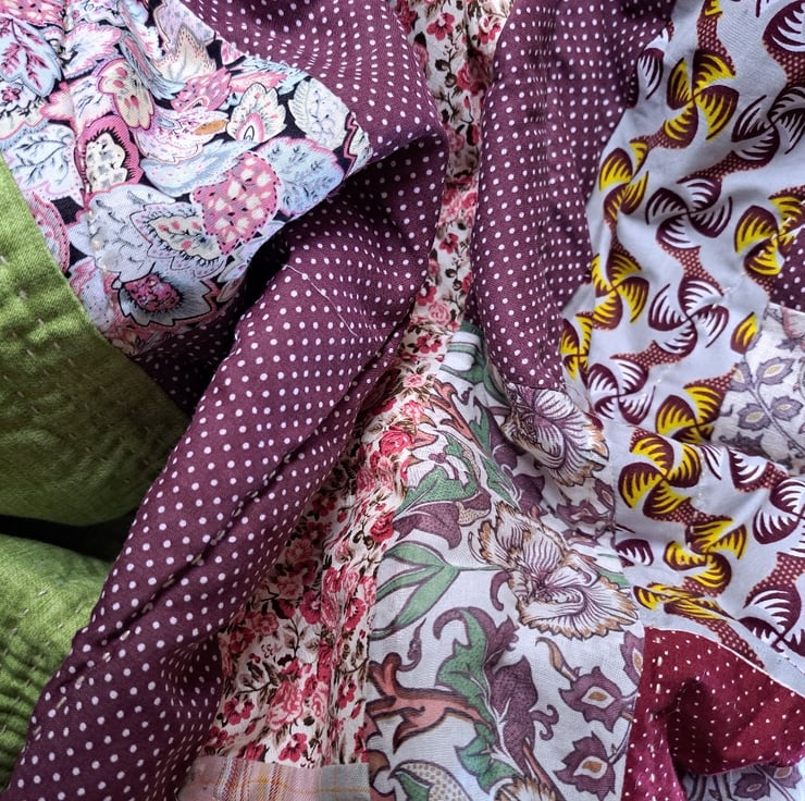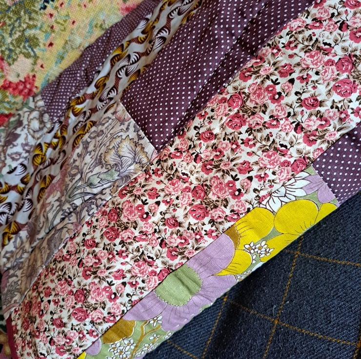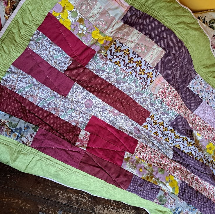 If you get a thrill out of beautiful, accurately pieced, intricate quilts, then look away now. This isn't for you. If, however, you need something bright, fun and easy to place under the cat or small child then you're in luck. This single/lap quilt measures 1.5m by 1m and is simply hand-quilted with a running stitch. It's made of vintage and new cotton scraps and... well, that's about it. Sometimes you just need an easy, basic, affordable, unfussy quilt that can get bashed about a bit.