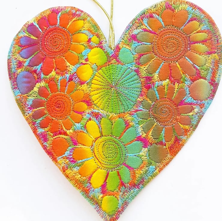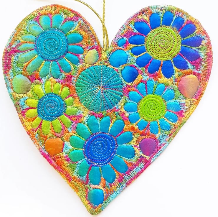 This is a handmade machine stitched fabric heart hanging decoration with heart motifs.