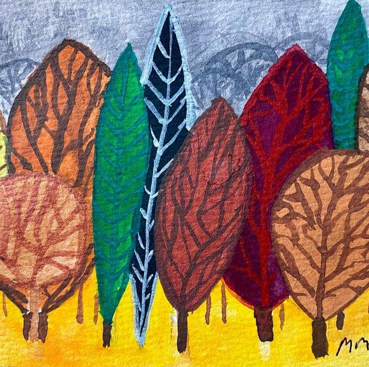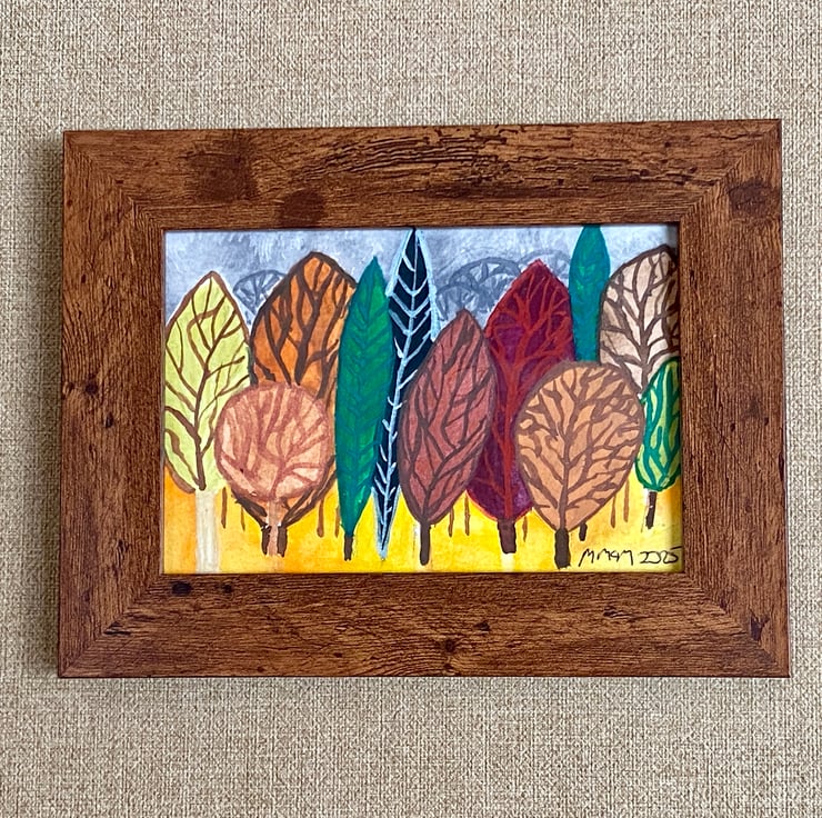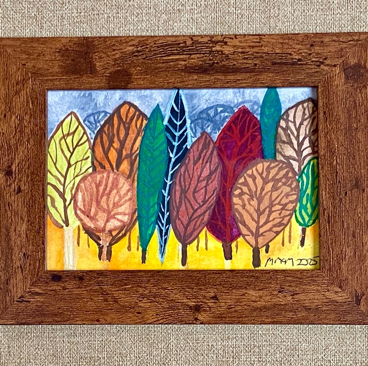 This is a vibrant abstract watercolour painting of trees. The painting measures approximately 10 x 15 cm. The frame measures 19.5 x 14.5 cm approximately. It is protected by a sheet of glass. The frame is made from plastic in a dark wood effect. It can be hung on the wall or sit on a sideboard or table. It is posted via Royal Mail 2nd class small parcel post.