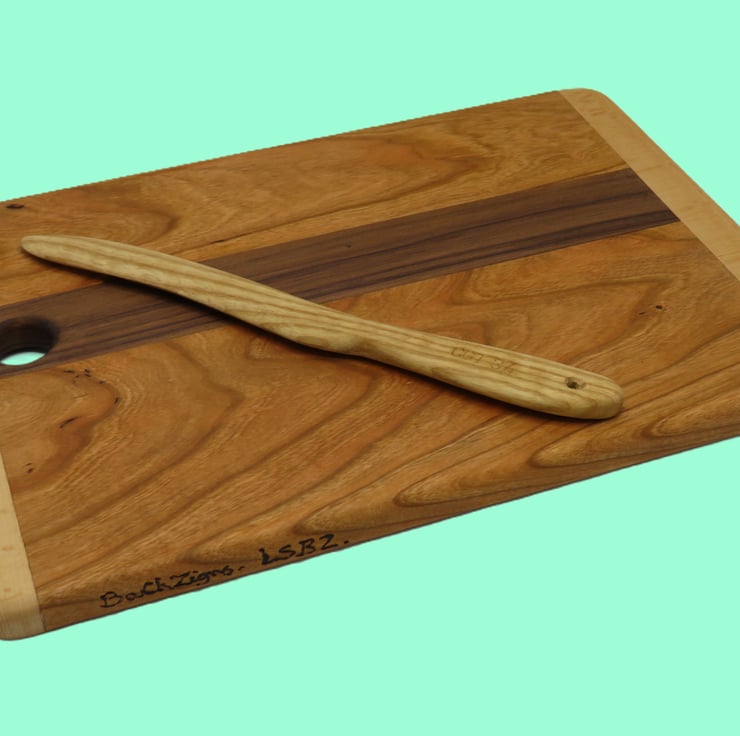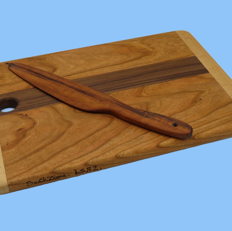 This serving board is made from various hardwoods namely Cherry and Black Walnut with an English Beech end clamps to reduce the curvature or bowing of the boards. There is a finger hole to allow you to more easily pick up the board from a kitchen worktop for instance. We have rounded over all the edges and finger hole to make the board easy to handle.