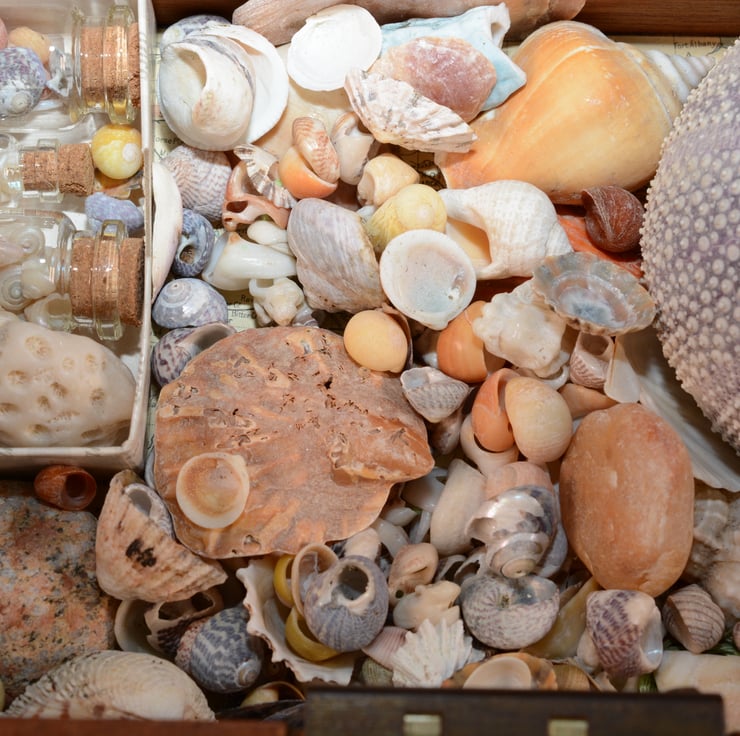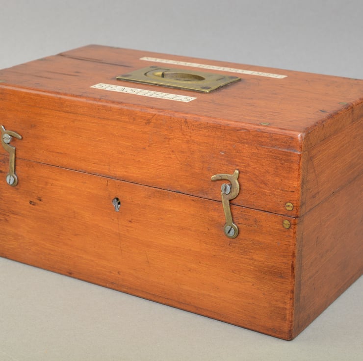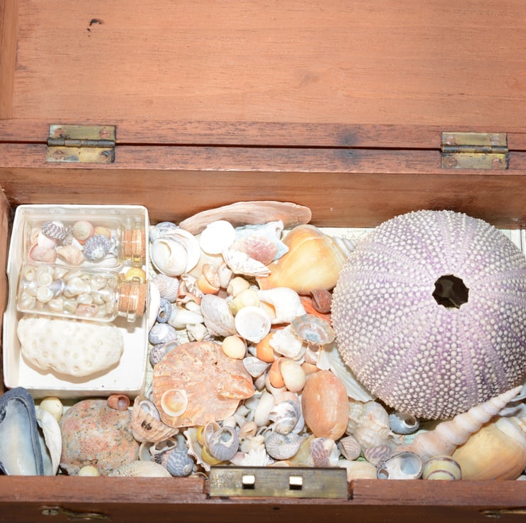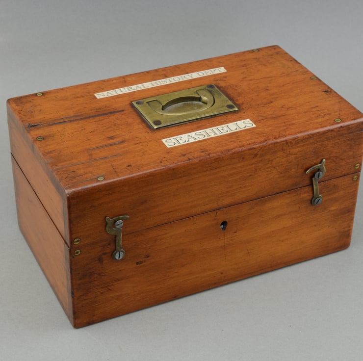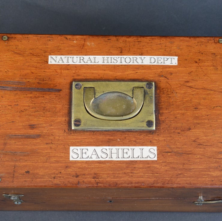 Inspired by the Victorian interest in the natural world. A Victorian antique mahogany box with brass fittings to which we have added aged paper labels and filled with various seashells. 24.5cms wide, 14cms deep and 12.5cms tall.