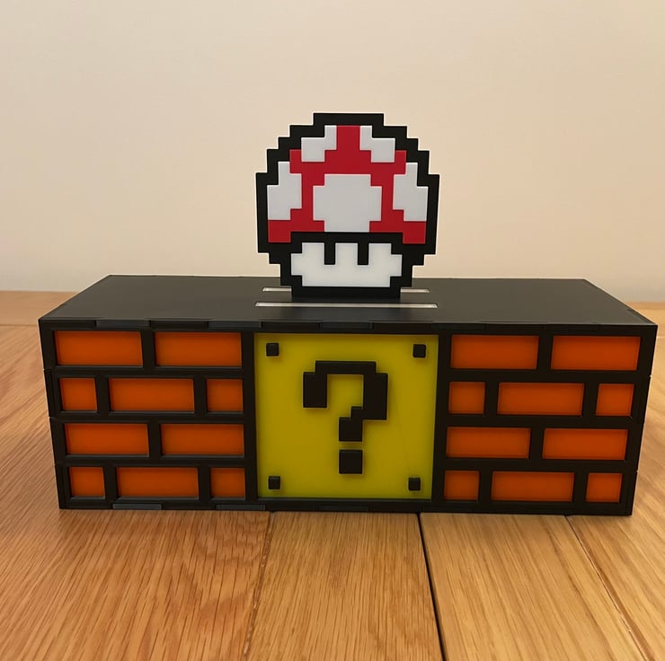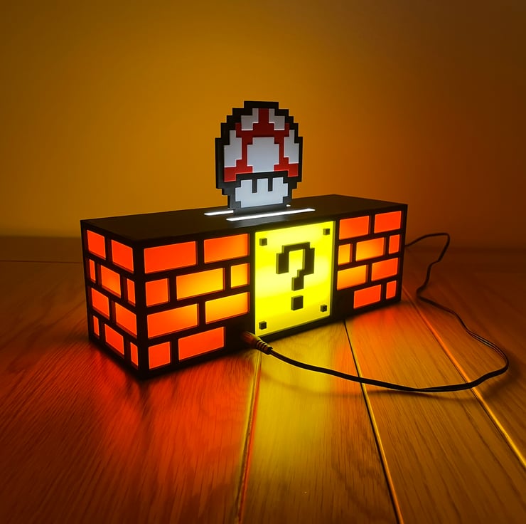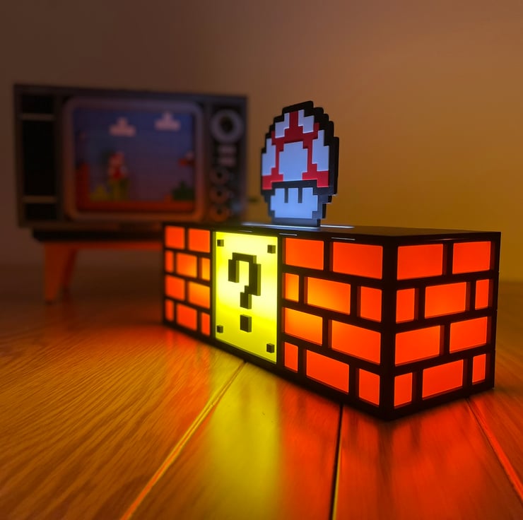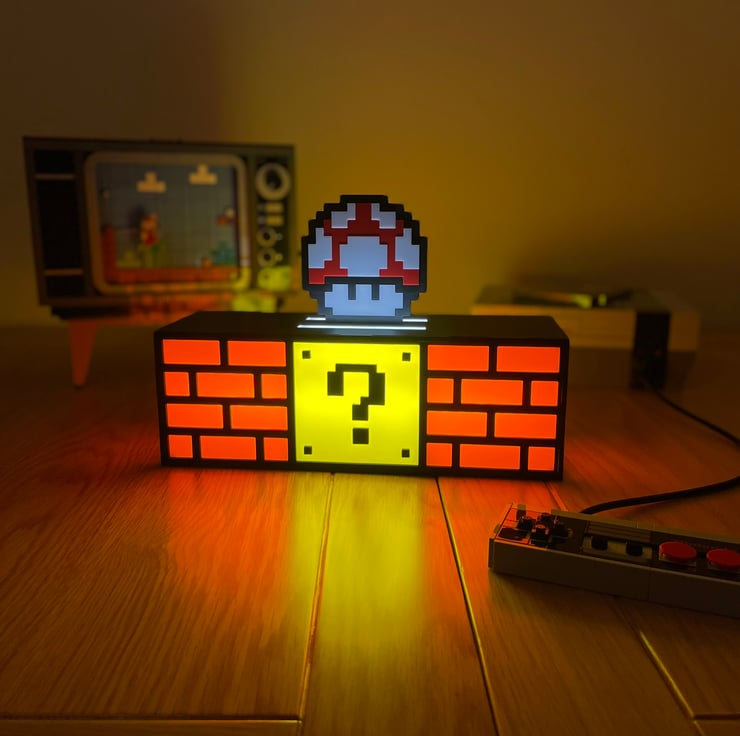 This lamp is inspired by one of the first features you encounter in the original Super Mario Bros. (1985). It features the iconic question mark block and bricks, staples of the Mario series that have remained beloved by fans through every iteration of the franchise. The lamp is switched on and off by inserting the Super Mushroom into the top—a playful nod to one of the most recognizable power-ups in gaming history.