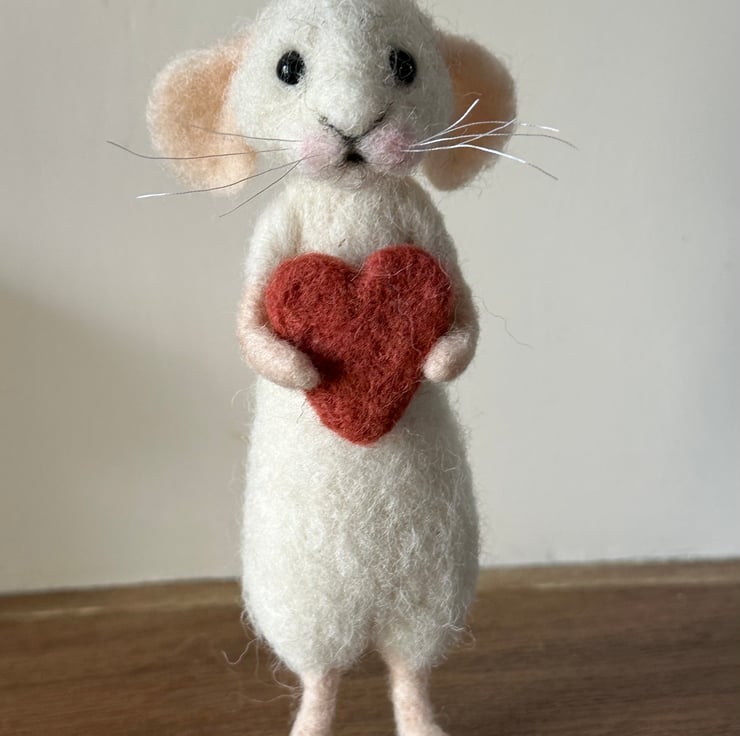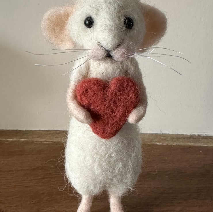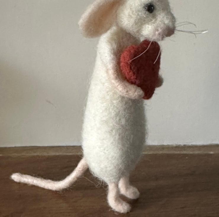Needle felted wool on wire armature with bead eyes cotton whiskers and unattached felted heart
