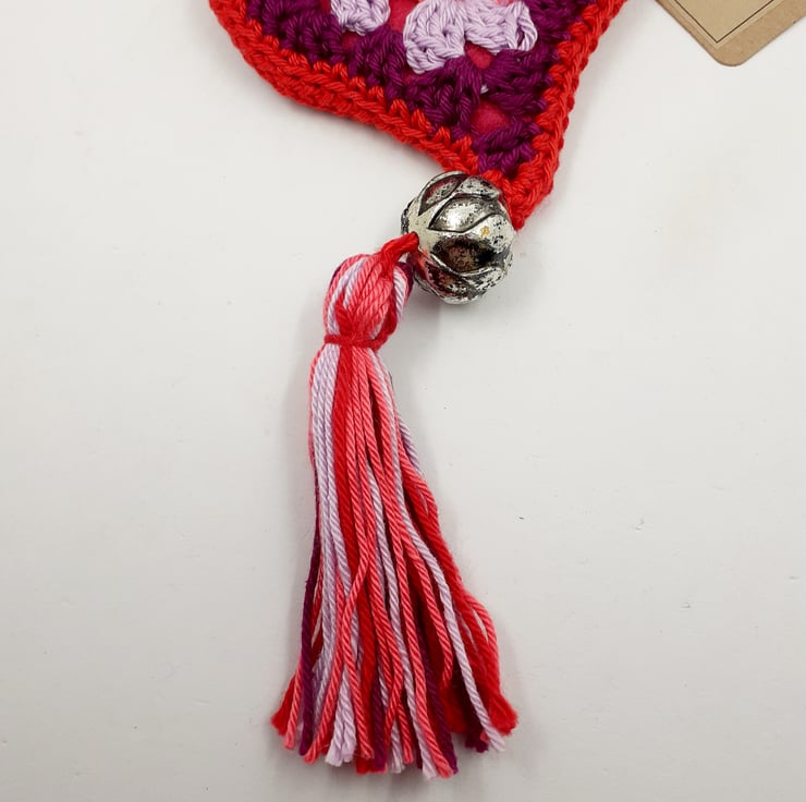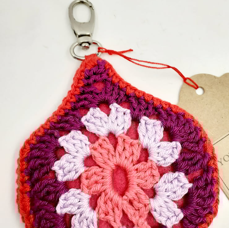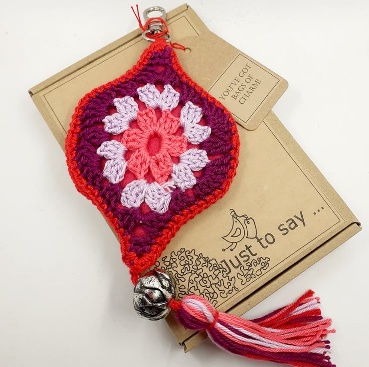 This large, cheerful bag charm is crocheted in cotton and lined with two layers of felt. It is the same front and back and is firmly sewn to a repurposed silver coloured latch fitting. The bottom of the decoration is embellished with a handmade tassel and silver coloured bead. This is a large charm measuring approximately 29 cm long and would therefore suit a large bag or a rucksack. The tag reads, 'You've got bags of charm!' The charm comes wrapped in tissue in a labelled PIP ( Postage in Proportion) box all ready to be given or posted on.