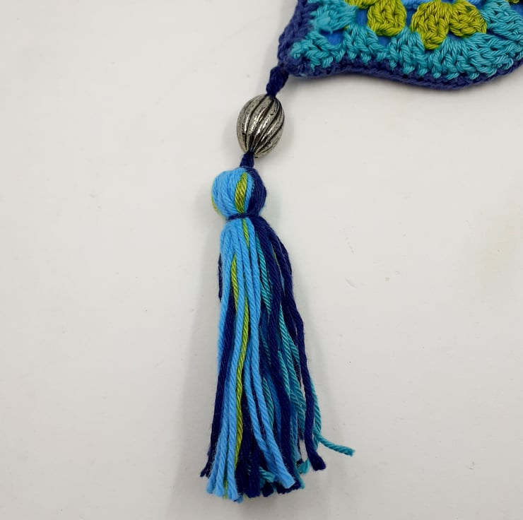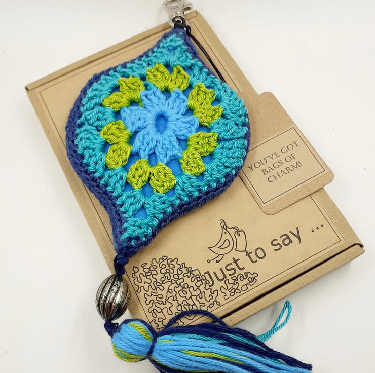 This large, cheerful bag charm is crocheted in cotton and lined with two layers of felt. It is the same front and back and is firmly sewn to a repurposed silver coloured latch fitting. The bottom of the decoration is embellished with a handmade tassel and silver coloured bead. This is a large charm measuring approximately 29 cm long and would therefore suit a large bag or a rucksack. The tag reads, 'You've got bags of charm!' The charm comes wrapped in tissue in a labelled PIP ( Postage in Proportion) box all ready to be given or posted on.