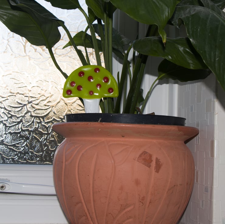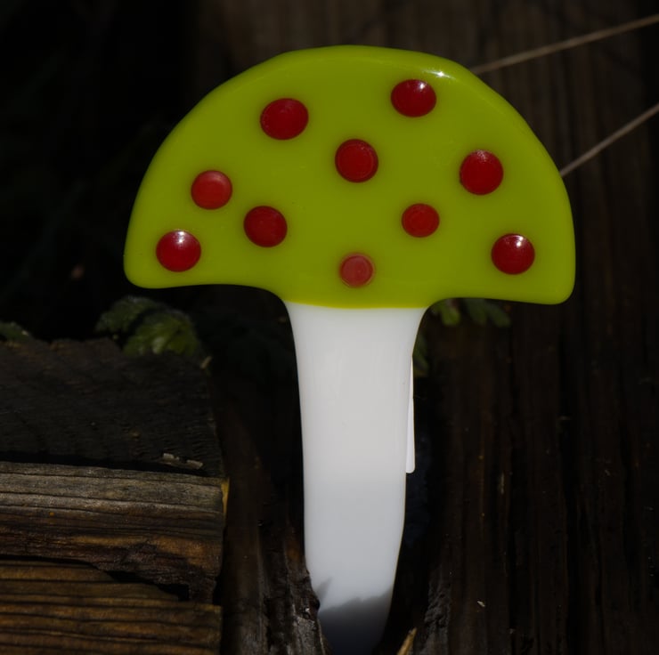 A piece of coloured glass that has been hand-cut and fused to a glass stalk makes the main part of this piece. We've added glass dots to give it even more character. It is approximately 14.5 cm tall.