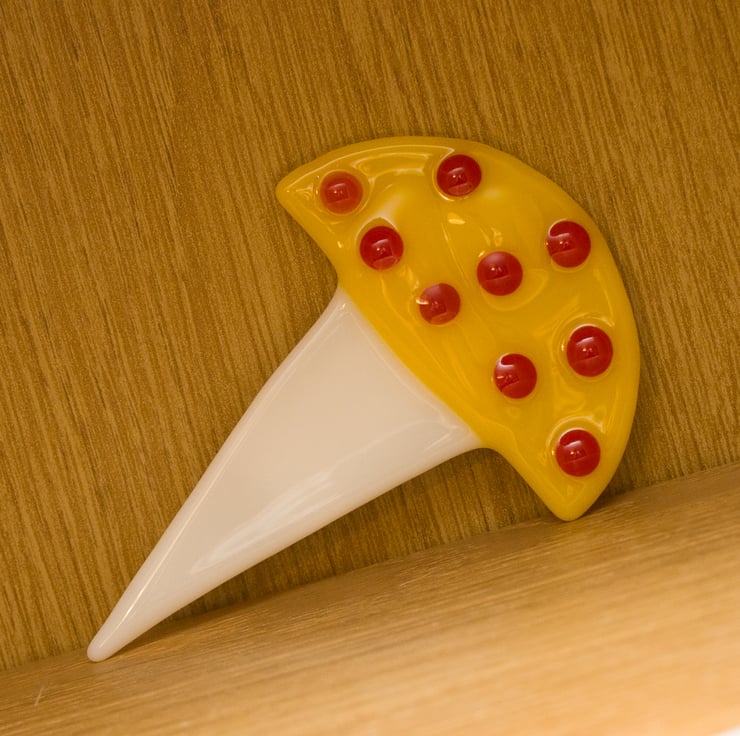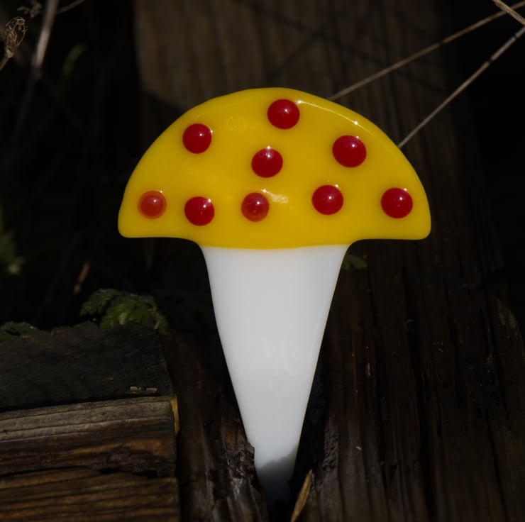 A piece of coloured glass that has been hand-cut and fused to a glass stalk makes the main part of this piece. We've added glass dots to give it even more character. It is approximately 12.5 cm tall.