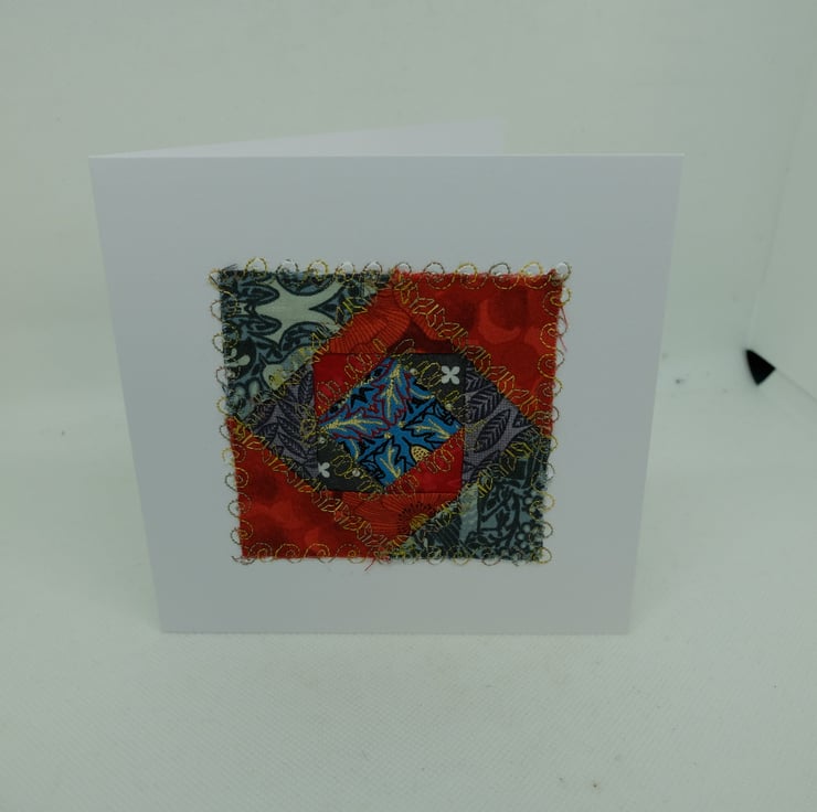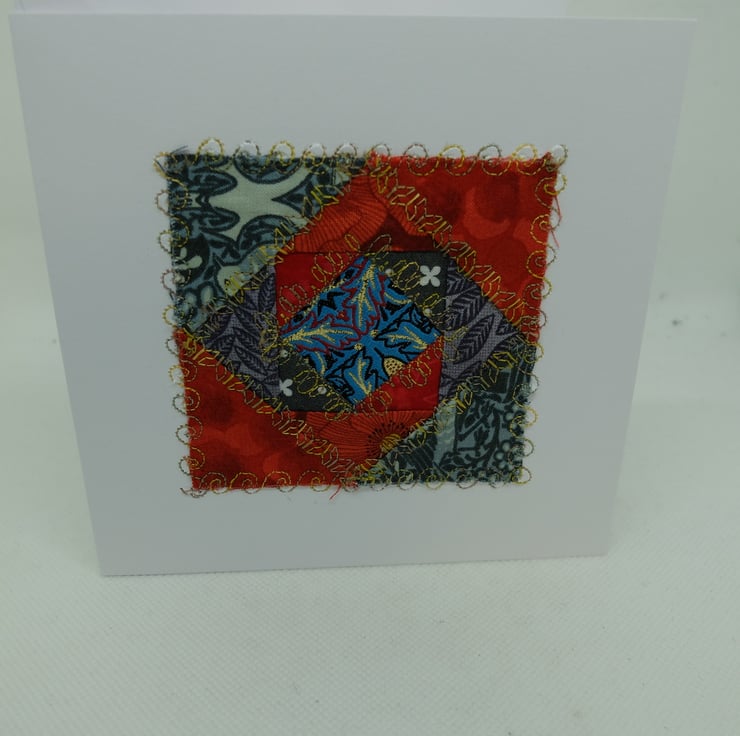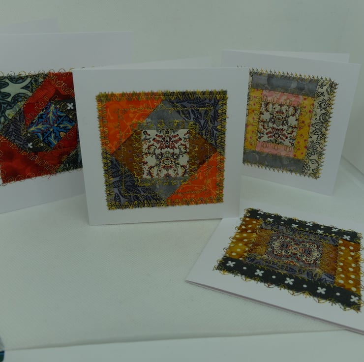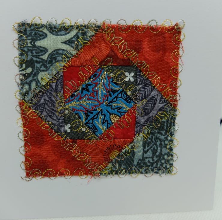 I am using up a range of unused quilt blocks, unfinished embroideries and various bits of ribbon and fabric to make a range of greetings cards.