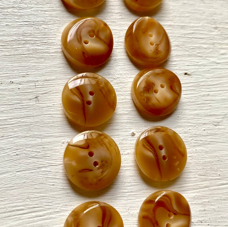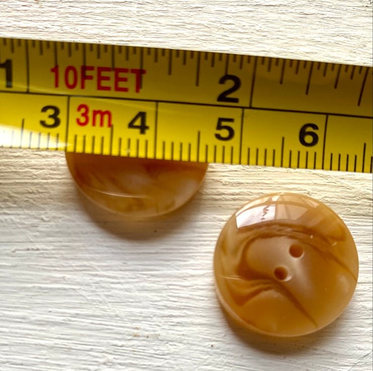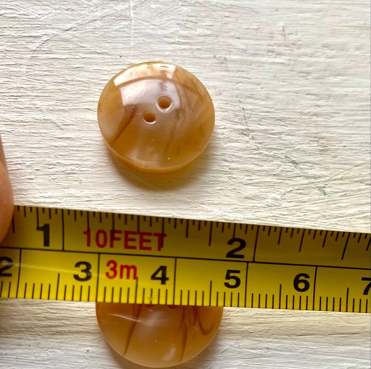 Just a touch over 1.5 cm diameter, flat with 2 holes. Smooth and shiny a nice set for a cardigan or blouse.
