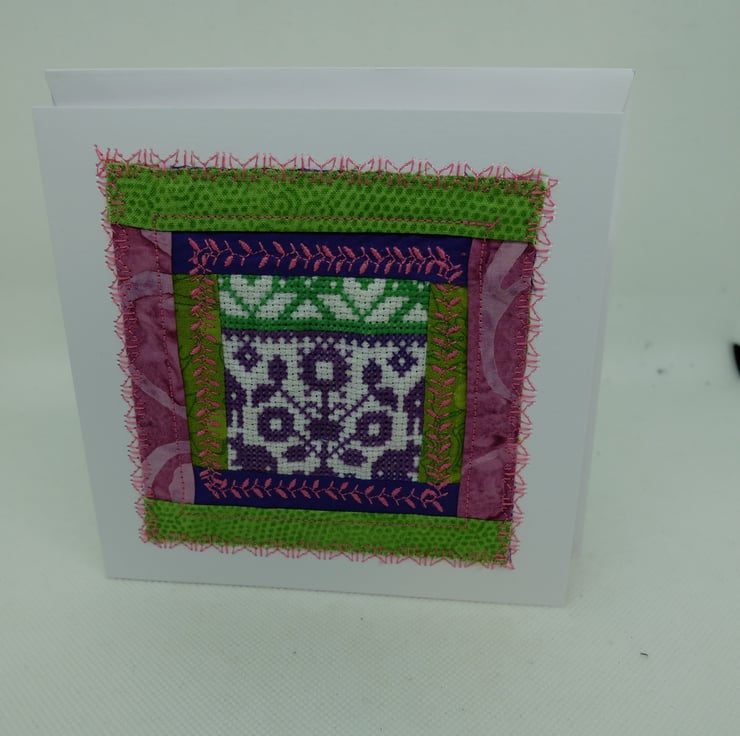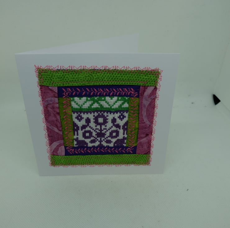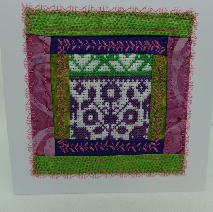 I am using up a range of unused quilt blocks, unfinished embroideries and various bits of ribbon and fabric to make a range of greetings cards.