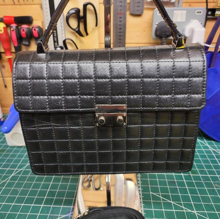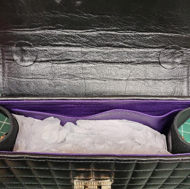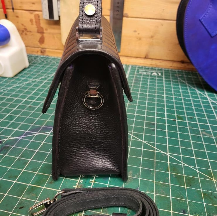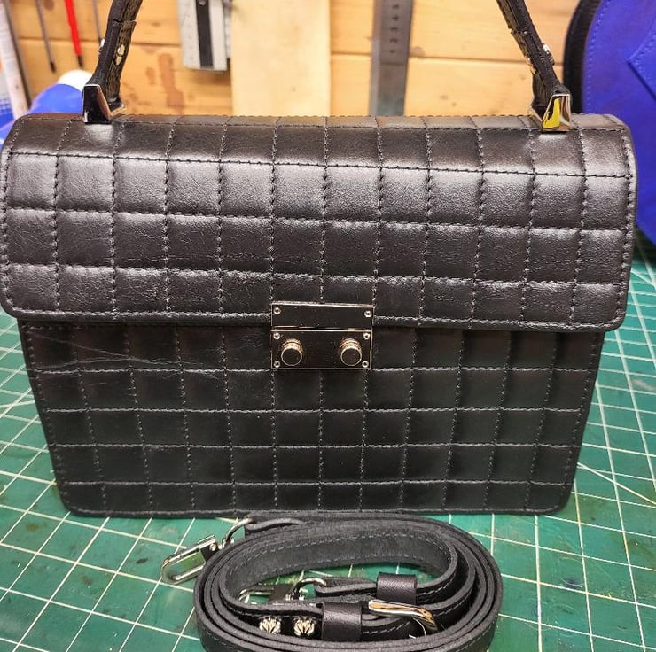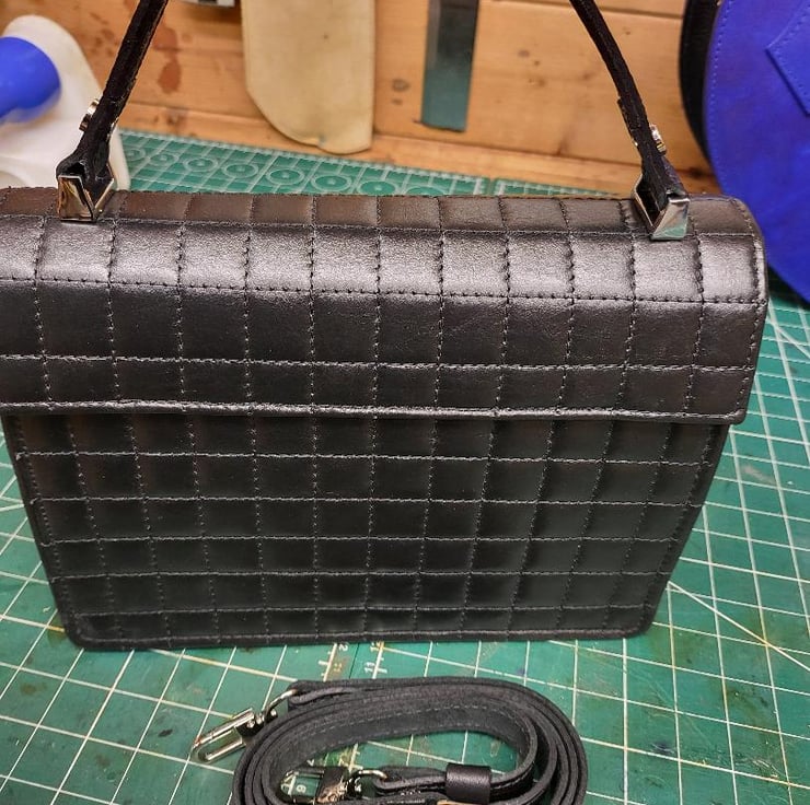 Black square Nappa leather bespoke hand bag made this week in Kent. This is beautiful Italian soft leather hide padded with soft but firm backing. It is firm but soft to touch very time consuming product. This is the first model of this particular hand bag. highly recommended if you like something different. Hide is whether protected.