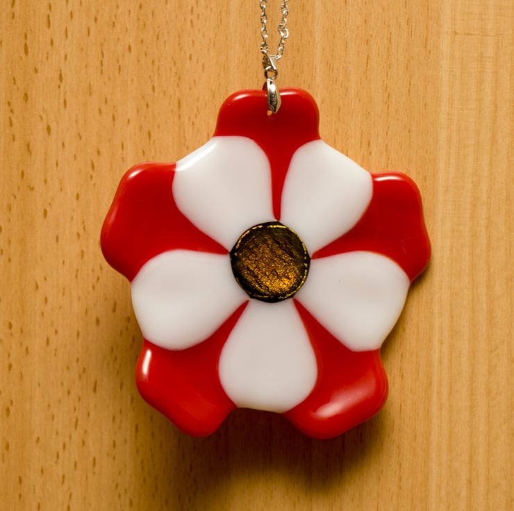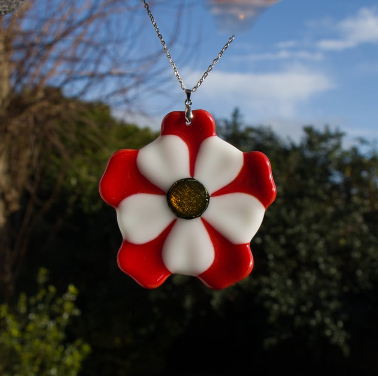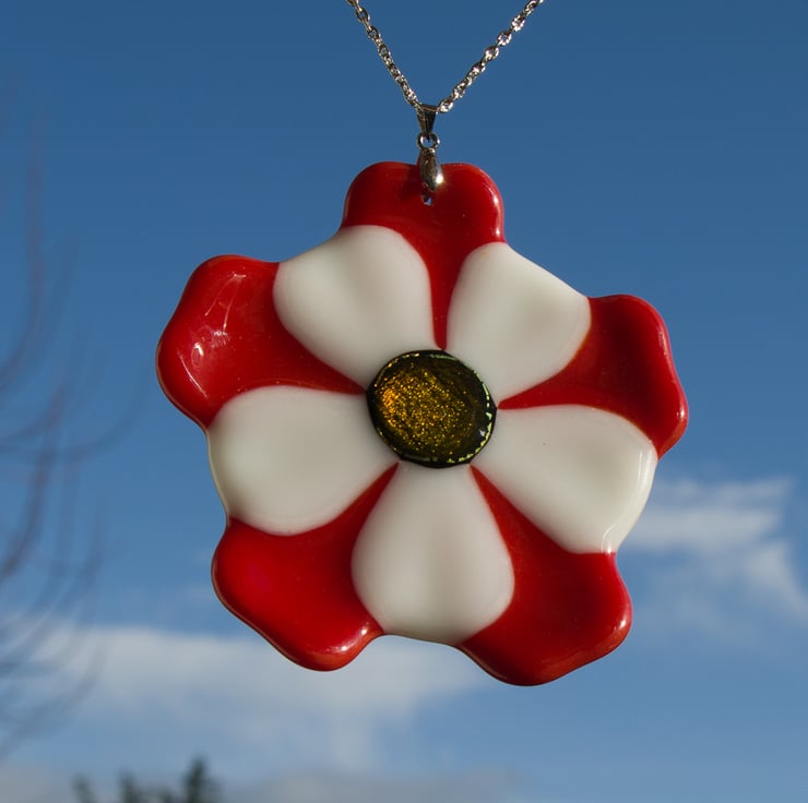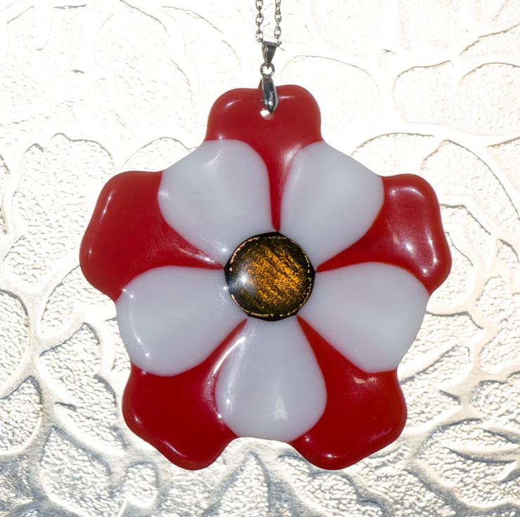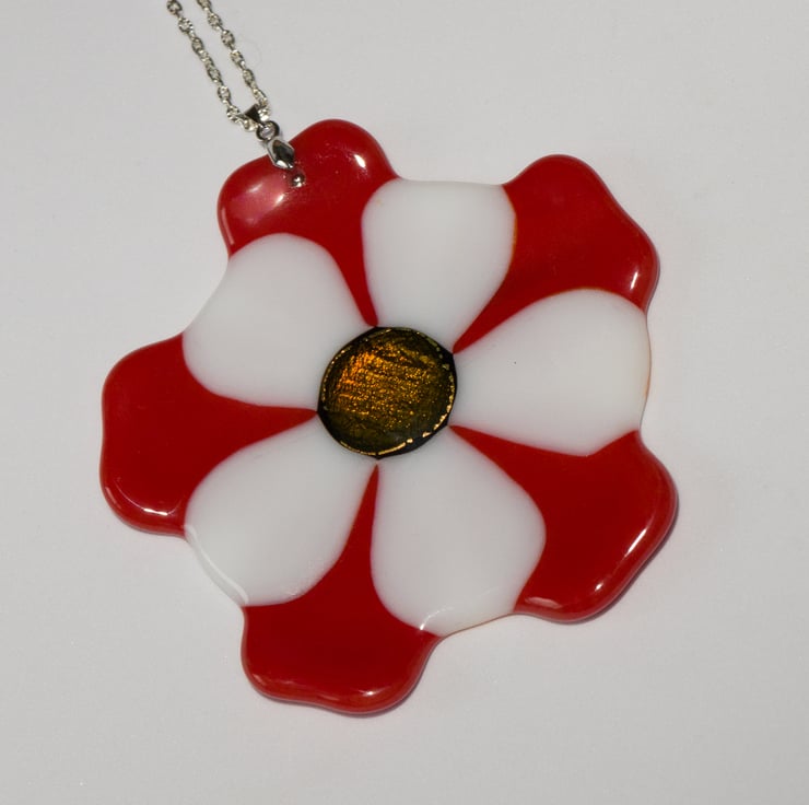Each of the 10 red and white petals has been hand-cut from flat sheet glass. They have been fused together in the kiln with a shiny glass dot creating the centre of the flower.
