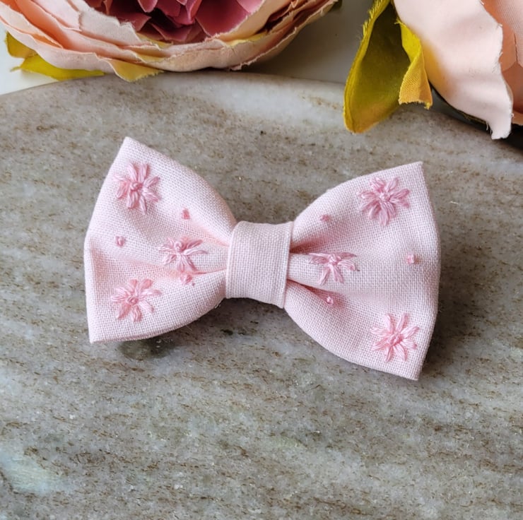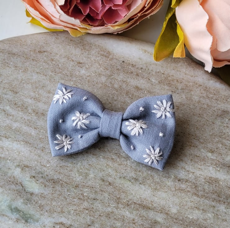 These hand embroidered hair clips and bows are lovingly made with high quality 100% cotton fabric & DMc embroidery floss.