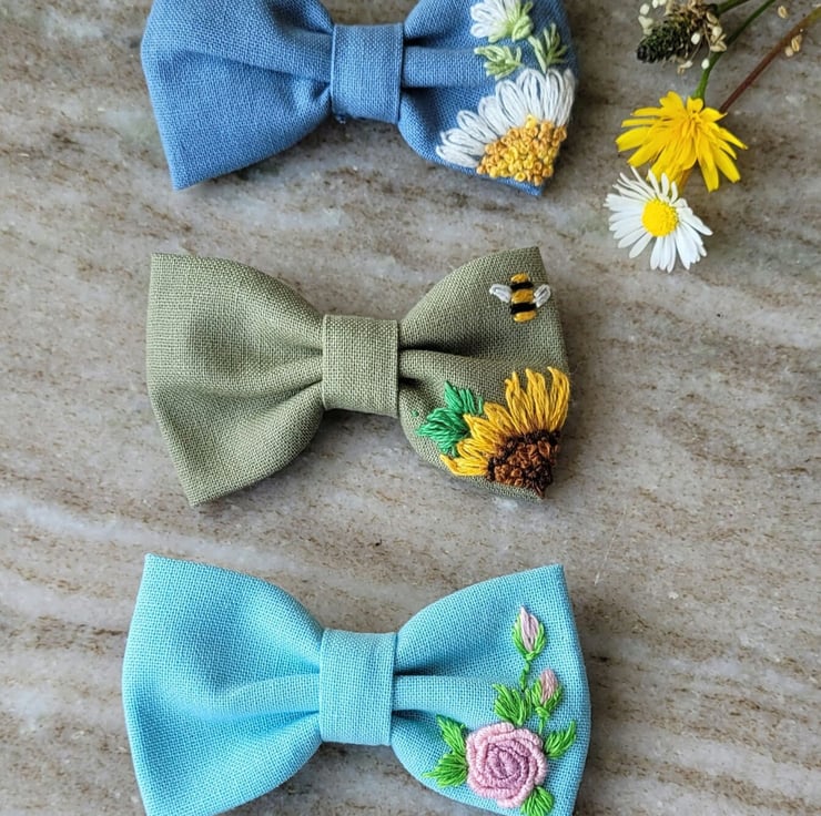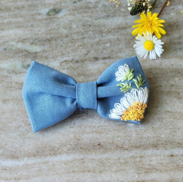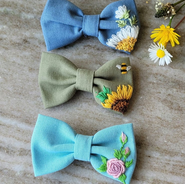 These hand embroidered hair bow clips are lovingly made with high quality 100% cotton and & DMC embroidery floss.